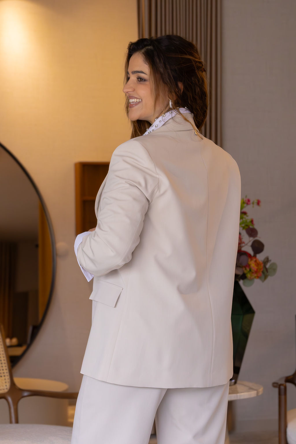 Na parte de trás, o design é simples e bem estruturado, com acabamento cuidado e forro interior em 100% poliéster, que assegura maior conforto ao vestir e um cair impecável. O tom bege torna esta peça extremamente fácil de conjugar, funcionando tanto em coordenados de alfaiataria como em looks mais descontraídos com jeans ou vestidos.