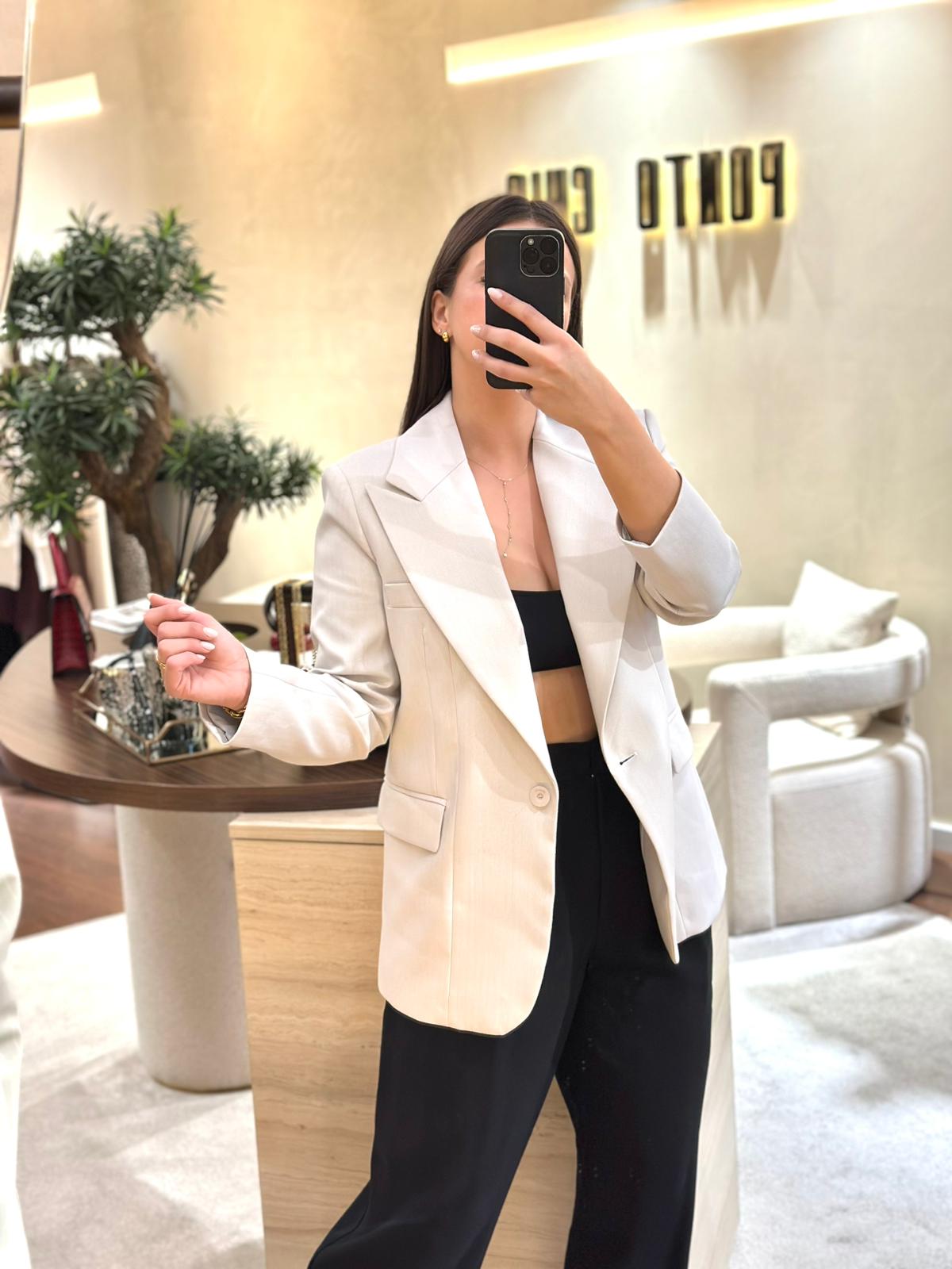 Com design inspirado na alfaiataria clássica, apresenta lapela tradicional, bolsos de aba e fecho com botões frontais, transmitindo sofisticação e intemporalidade. O tom bege acrescenta neutralidade e facilidade de combinação, tornando-o numa peça indispensável em qualquer estação.