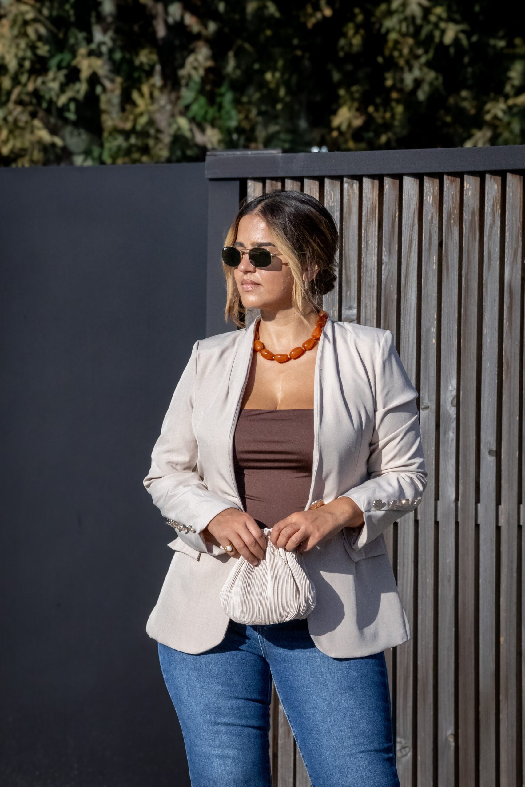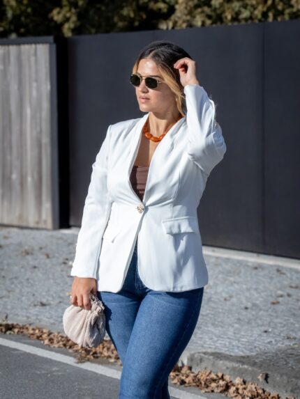 O blazer beige Ponto Chic é a definição de sofisticação versátil, perfeito para looks elegantes em qualquer estação. Confeccionado em 95% poliéster e 5% elastano, garante conforto, estrutura e um caimento impecável.