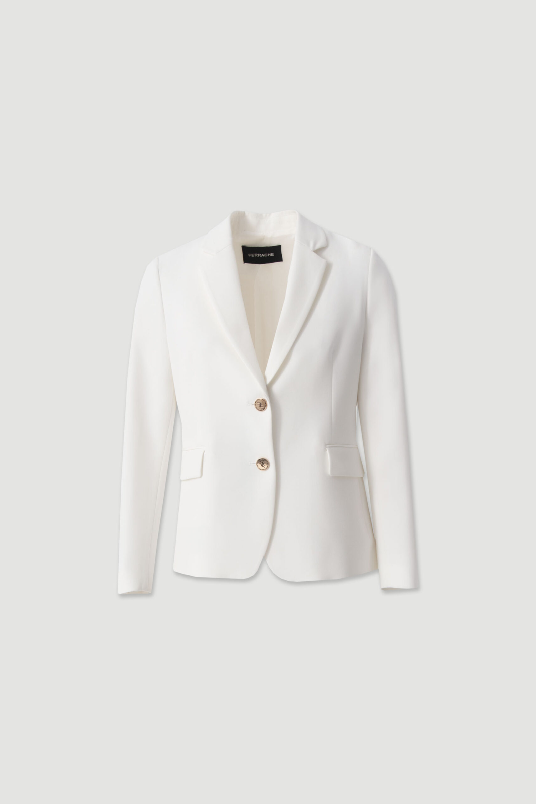Blazer branco clássico da marca Ferrache, confecionado em tecido confortável com 88% poliéster e 12% elastano, que proporciona um caimento elegante e liberdade de movimento.