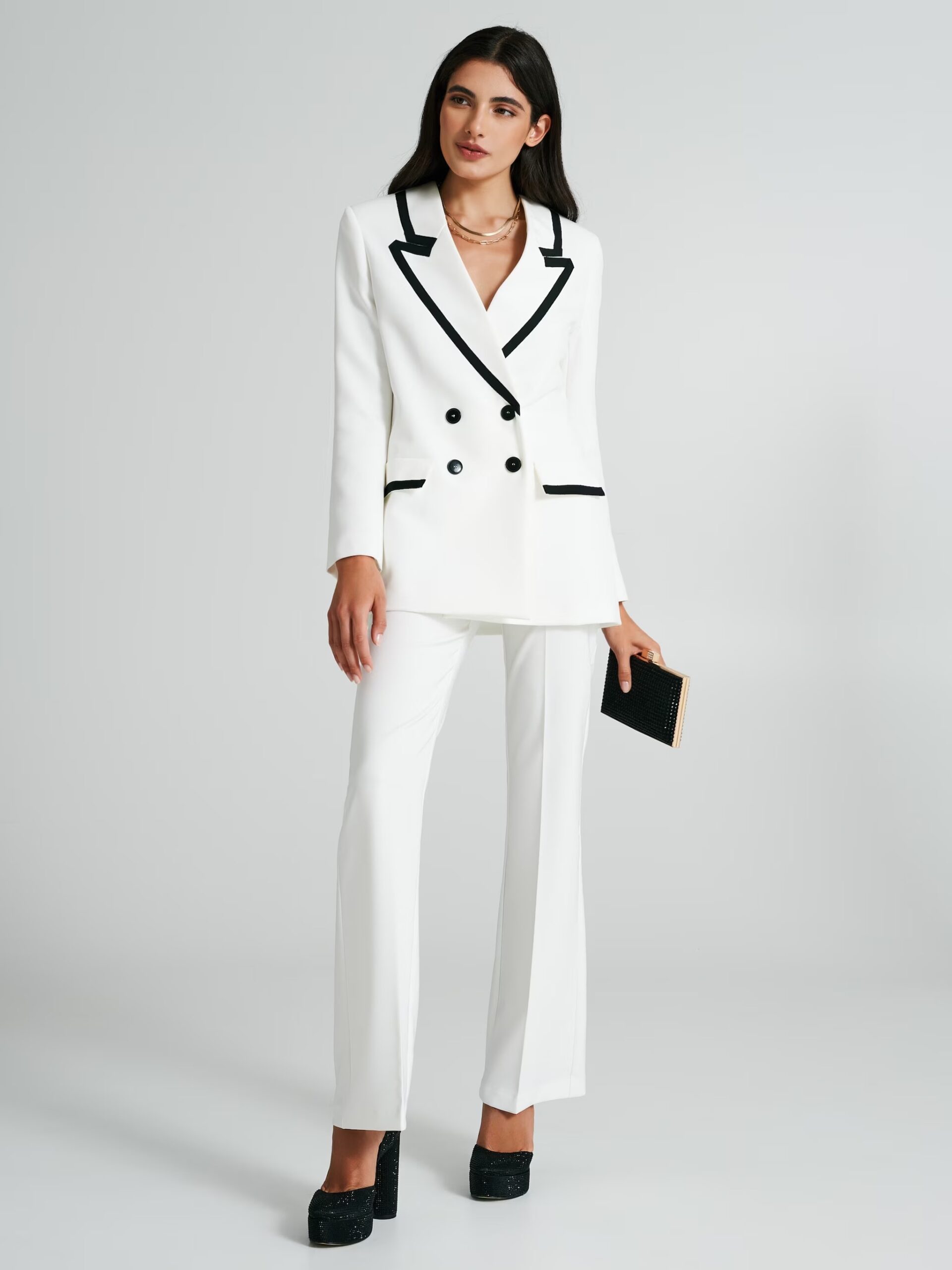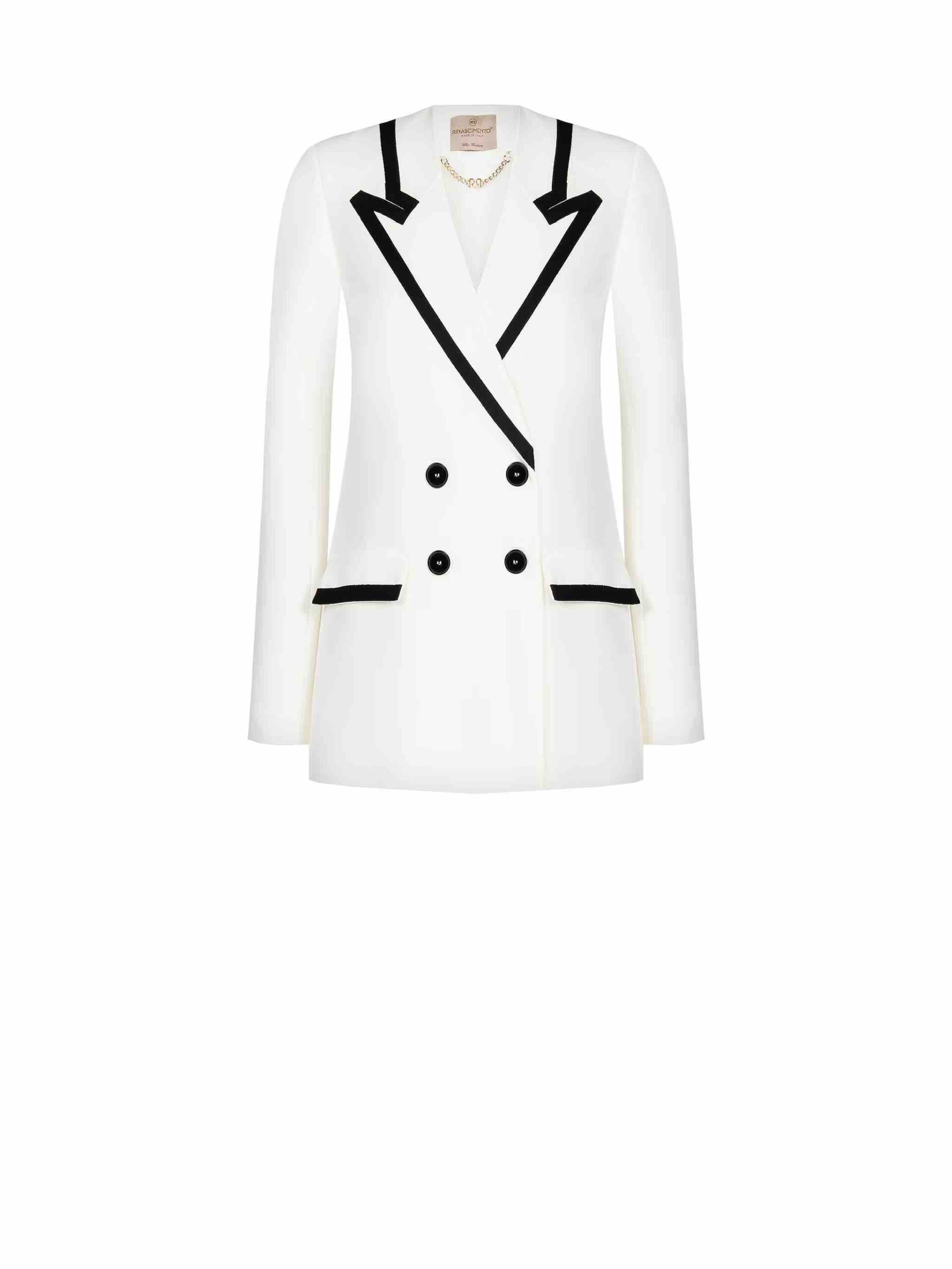 Com corte estruturado e lapelas em perfil preto, o modelo destaca-se pelo fecho cruzado com botões frontais e pelo jogo gráfico entre o branco puro e os detalhes escuros. O tecido com elastano garante conforto e um caimento impecável.