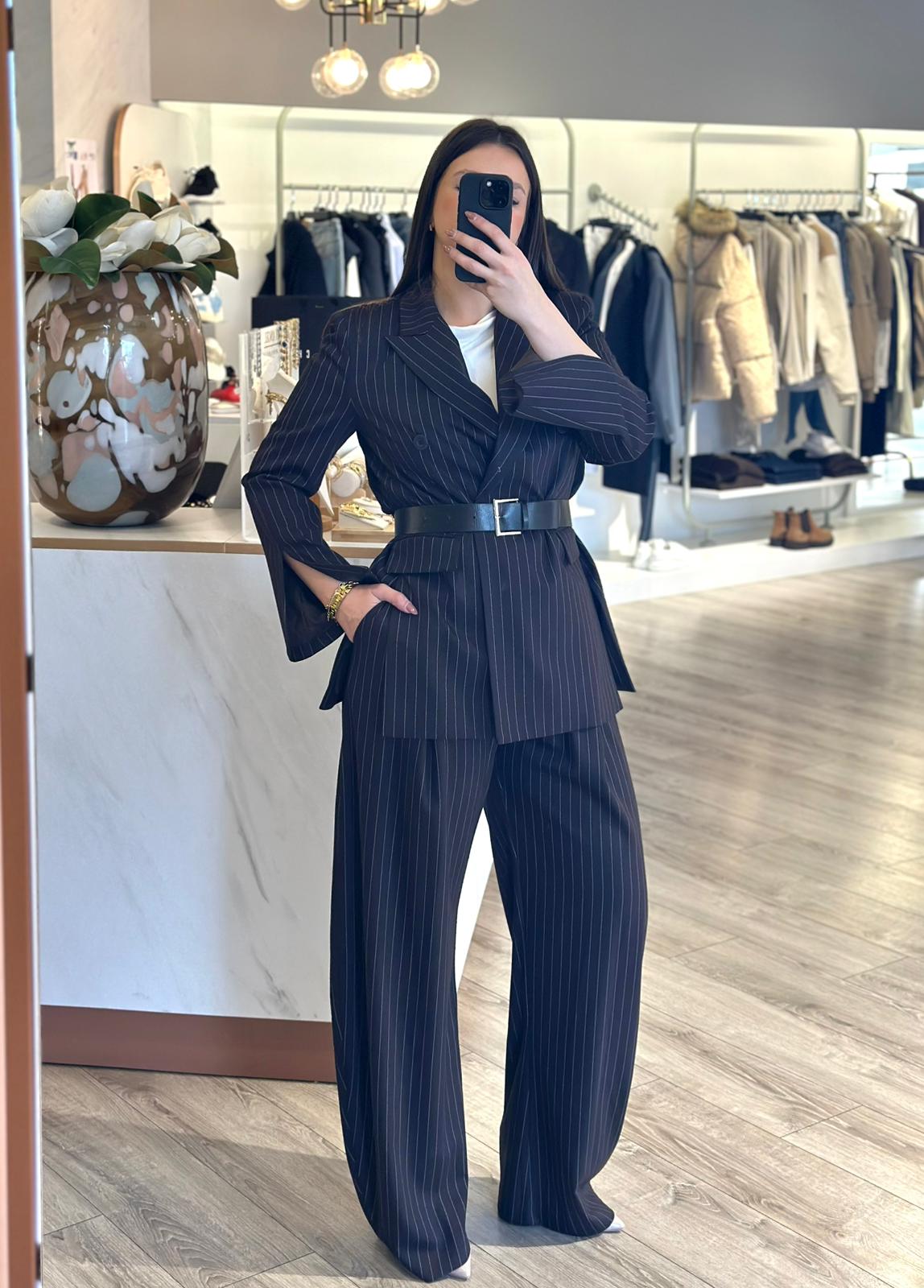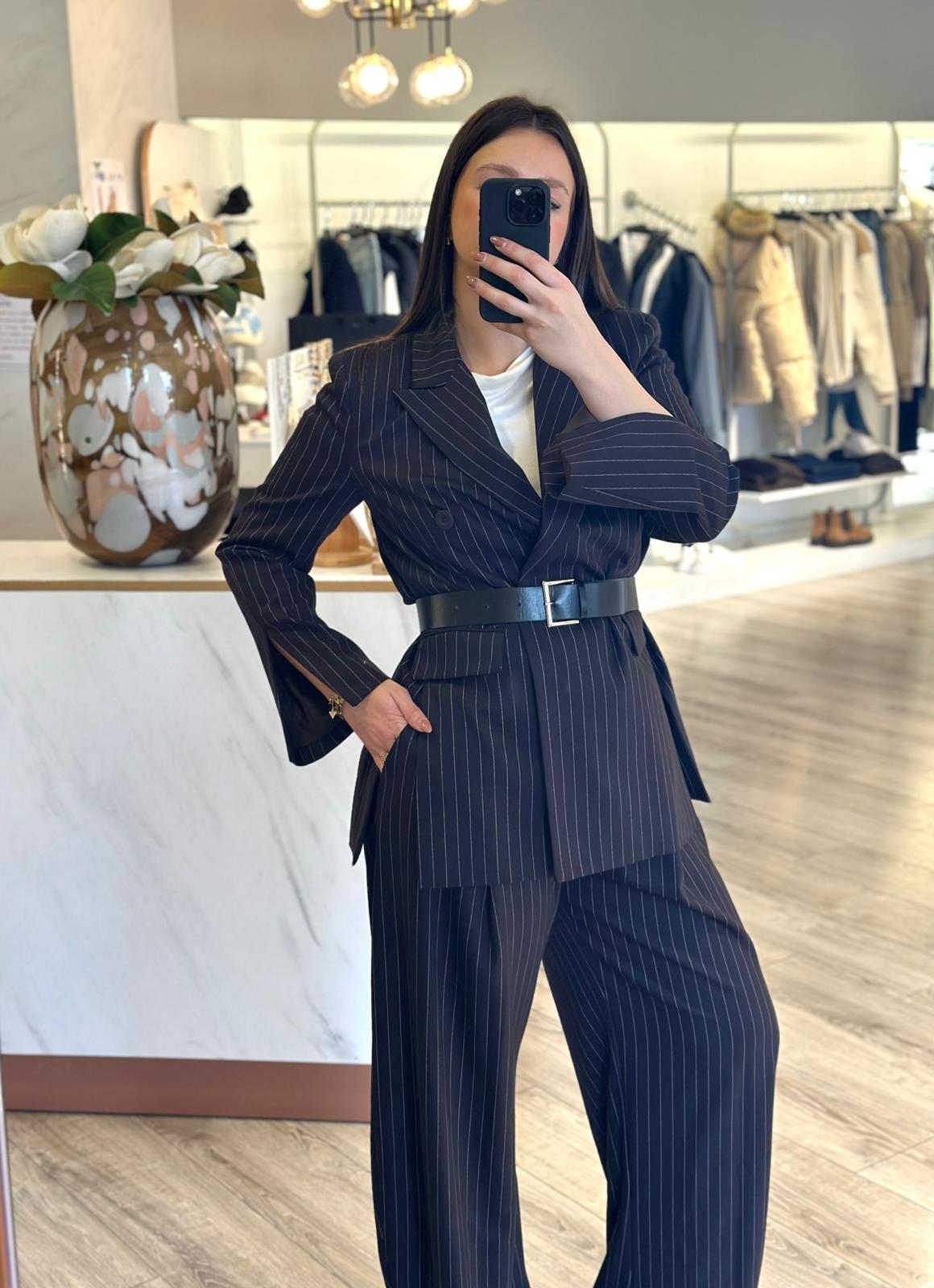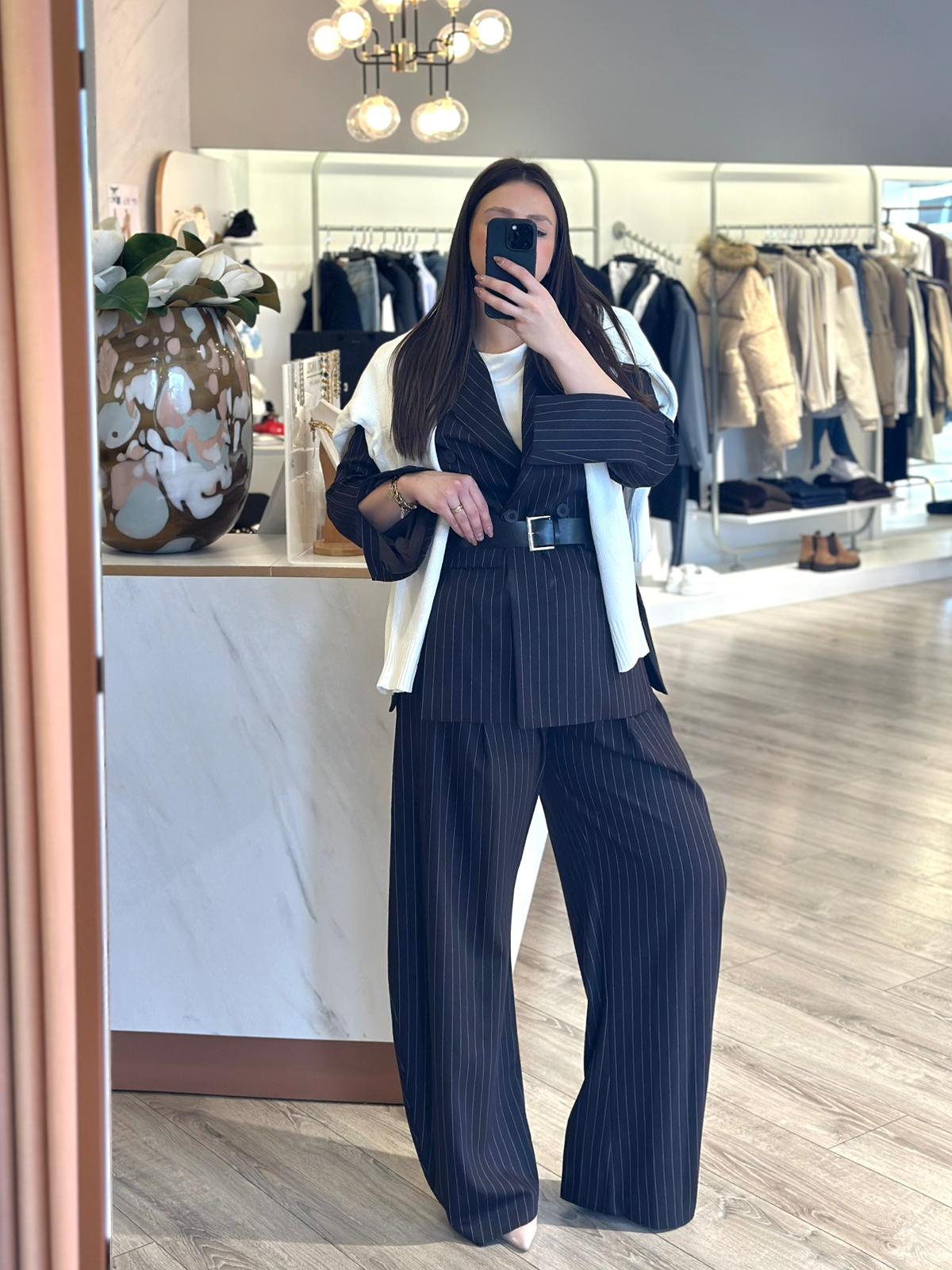 Com fecho frontal por botões e corte ajustado, o design realça a silhueta e adiciona um toque de distinção a qualquer coordenado. As riscas verticais finas inspiradas na alfaiataria tradicional conferem-lhe um ar refinado e atemporal.