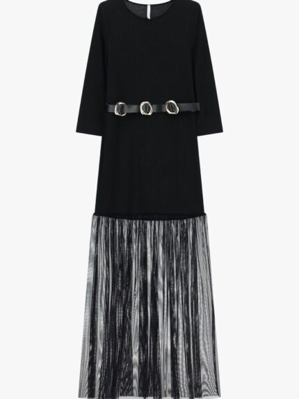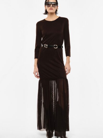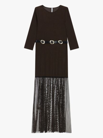 VESTIDO CASTANHO COM DETALHE DE TULE E CINTO IMPERIAL