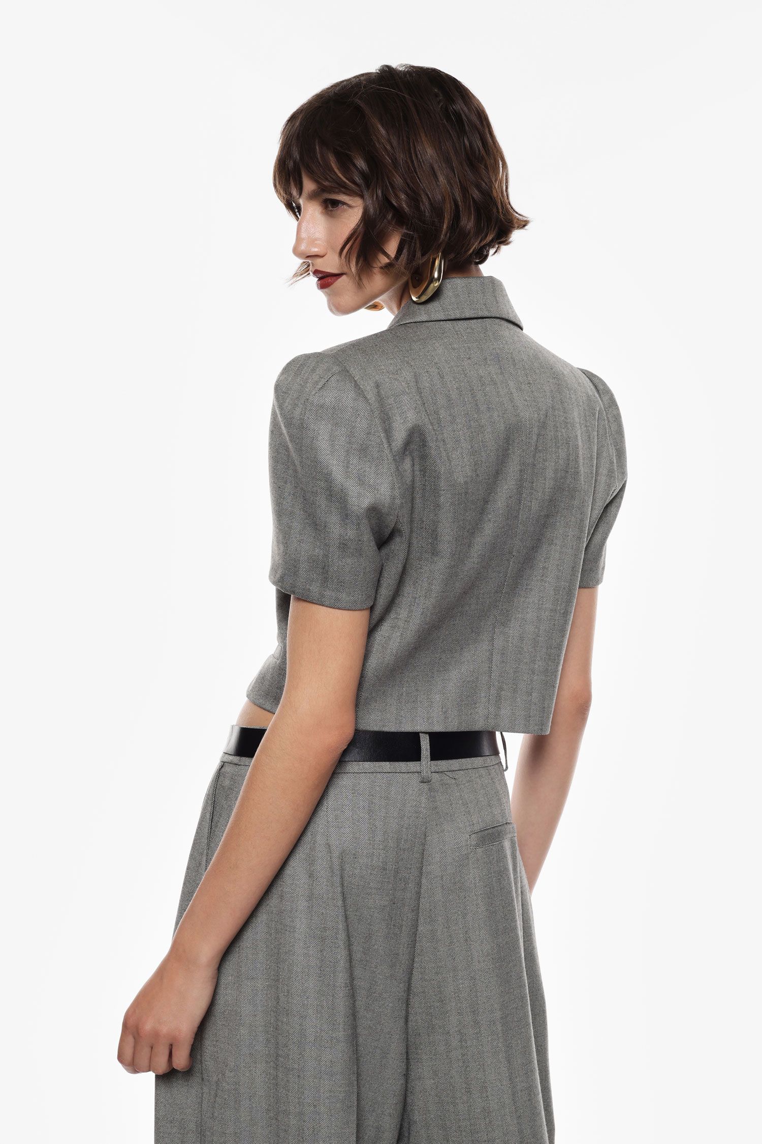 O blazer curto cinzento de manga curta da marca Imperial é uma peça distinta e moderna, perfeita para quem procura elegância com um toque contemporâneo. O tom cinza com padrão subtil em espinha garante sofisticação, enquanto o corte estruturado e a silhueta cropped criam uma abordagem jovem e ousada ao clássico blazer.