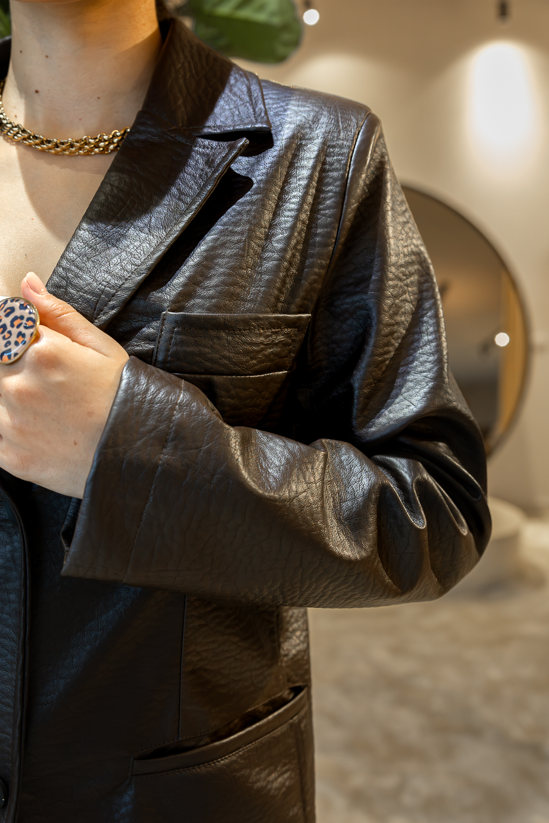 Este blazer castanho da Rinascimento traduz o equilíbrio entre elegância e atitude contemporânea. Produzido em ecopele texturizada (60% poliuretano, 40% poliéster), o modelo destaca-se pelo toque suave, aspeto luxuoso e estrutura perfeita que molda a silhueta sem rigidez.