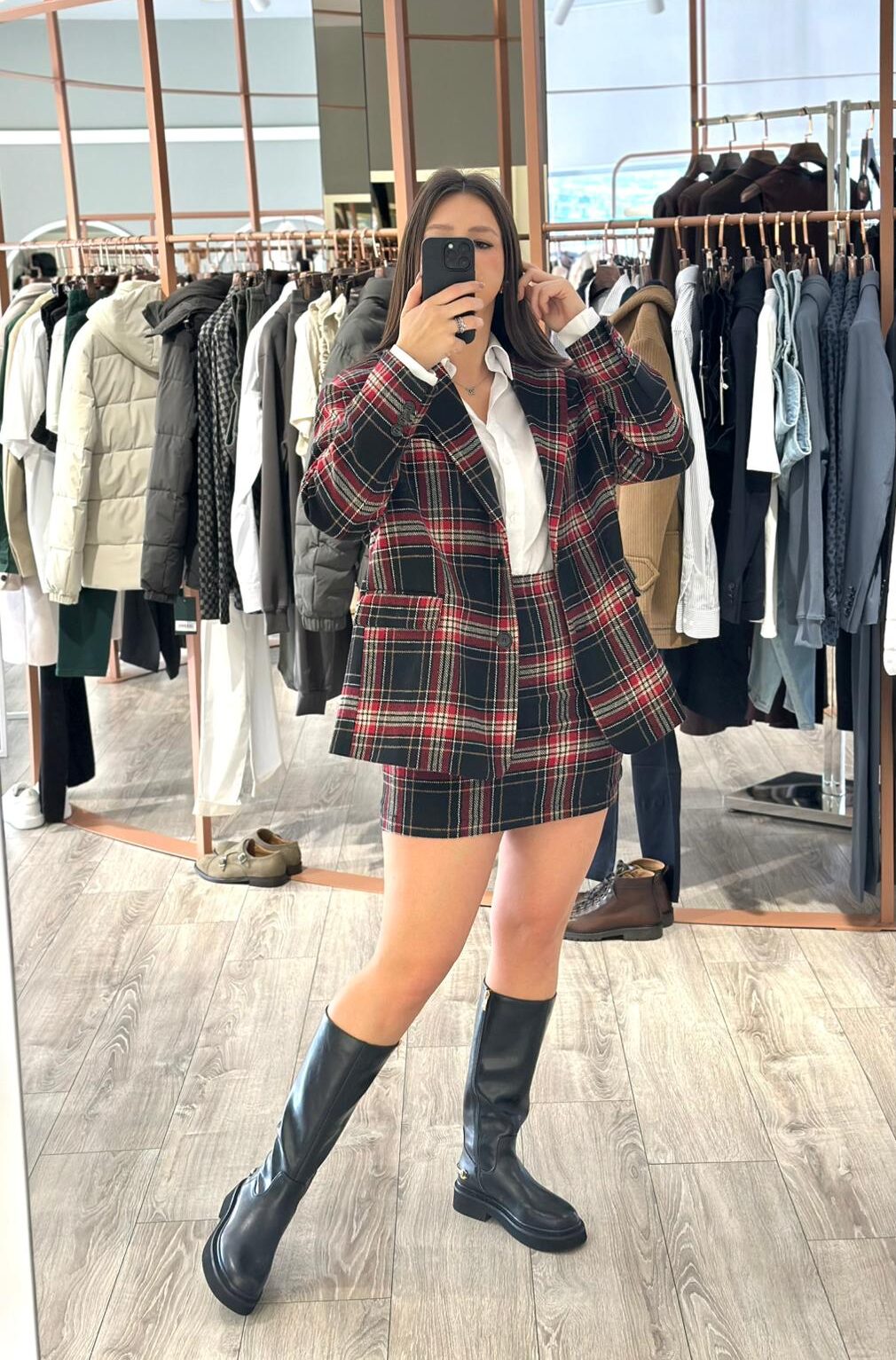 O blazer Imperial em padrão xadrez vermelho, preto e bege é uma peça de destaque que une elegância clássica e atitude contemporânea.