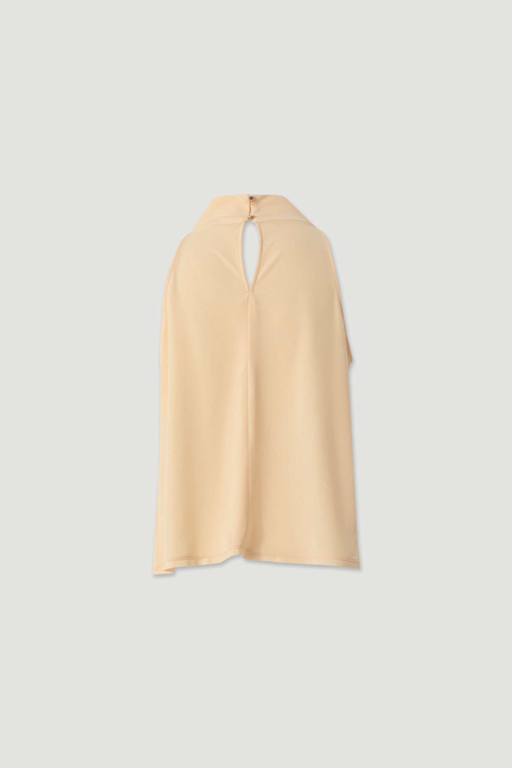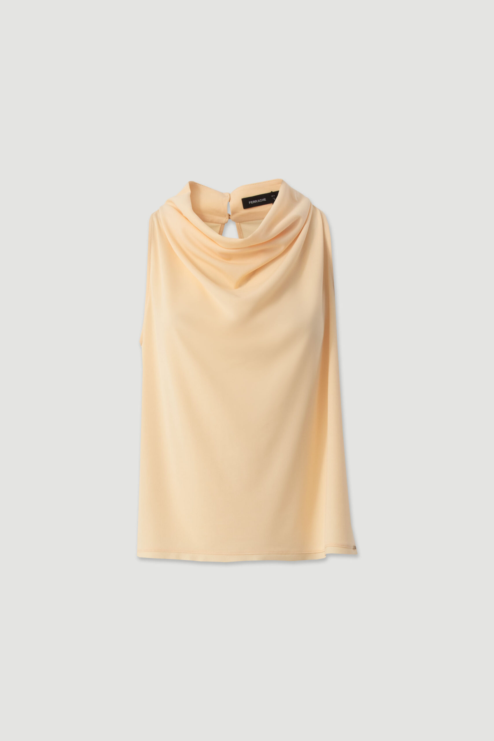 Destaca-se pelo decote drapeado que cria um efeito sofisticado e valoriza o colo de forma subtil. O design sem mangas reforça a leveza da peça, enquanto o fecho discreto na parte posterior garante um acabamento cuidado e funcional.