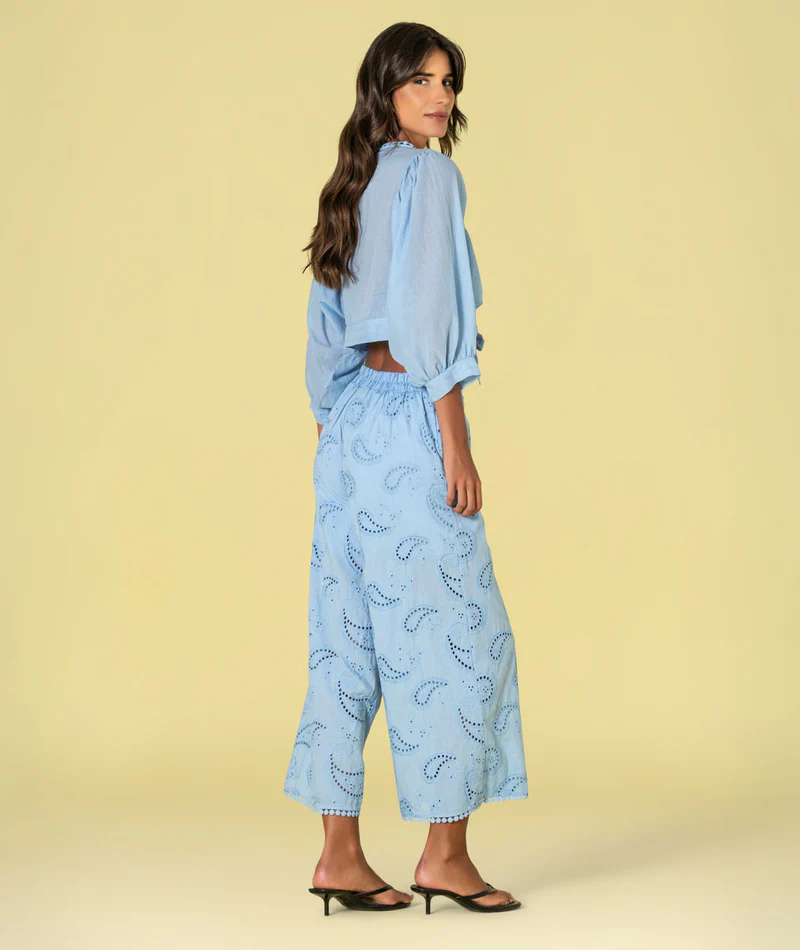 Na parte frontal, a blusa apresenta botões e um delicado bordado inglês que percorre a peça, acrescentando textura e um toque artesanal. O detalhe de atar na base permite ajustar a peça, valorizando a silhueta de forma leve e feminina.