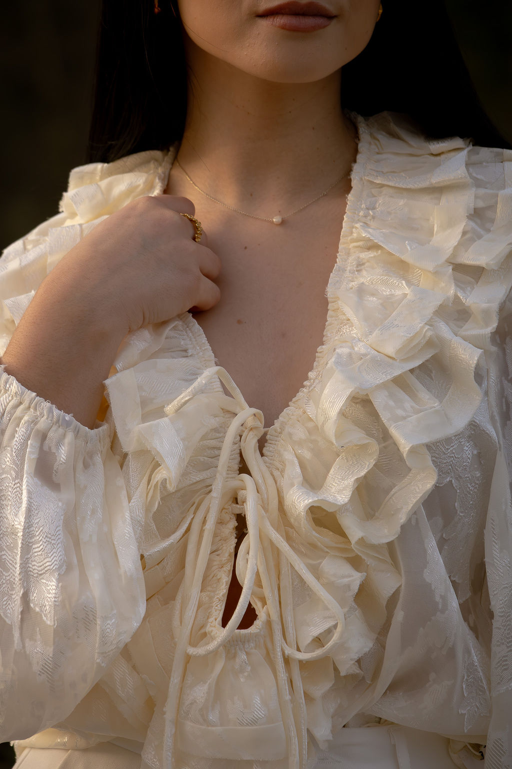 As mangas compridas apresentam corte fluido com punho elástico, proporcionando conforto e um cair leve no braço. O decote inclui cordões ajustáveis que permitem adaptar a abertura e acrescentam um detalhe delicado ao design.