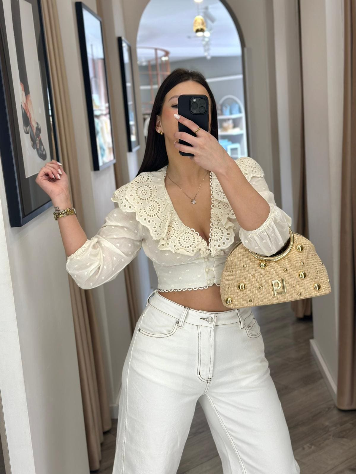 BLUSA BEGE COM RENDA E BORDADO PONTO CHIC