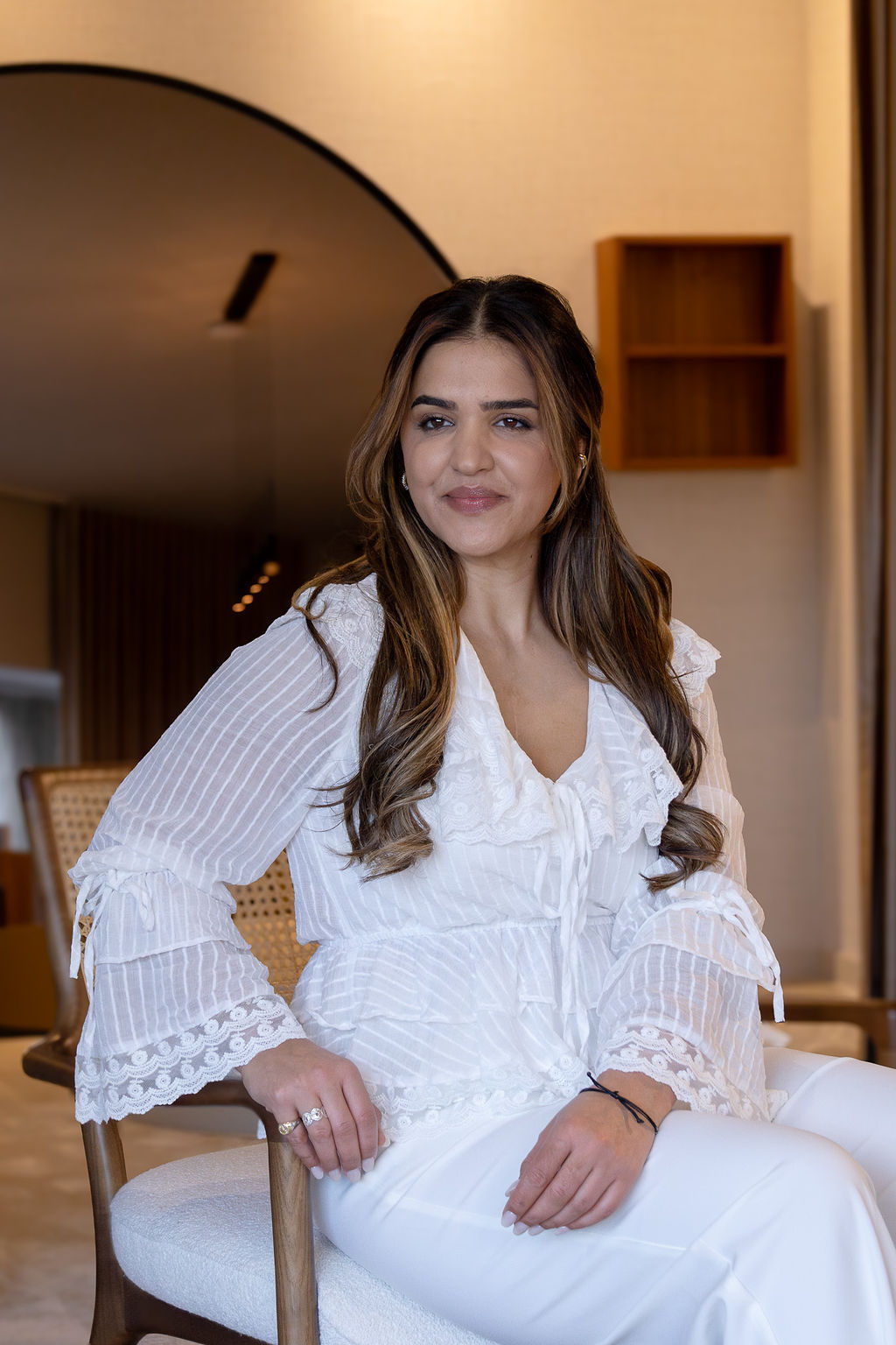 O decote em V é valorizado por uma aplicação de renda delicada, que se estende pela frente e ombros, conferindo um toque elegante e refinado à peça. As mangas compridas terminam em punhos franzidos com detalhe rendado, reforçando o caráter romântico e cuidado do design.