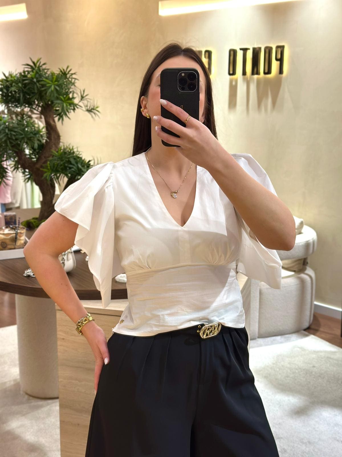 Com decote em V, mangas curtas amplas em estilo borboleta e corte cropped, esta blusa destaca-se pela leveza e pelo design moderno. O detalhe franzido na cintura valoriza a silhueta e acrescenta feminilidade, enquanto o branco intemporal garante combinações fáceis e elegantes.