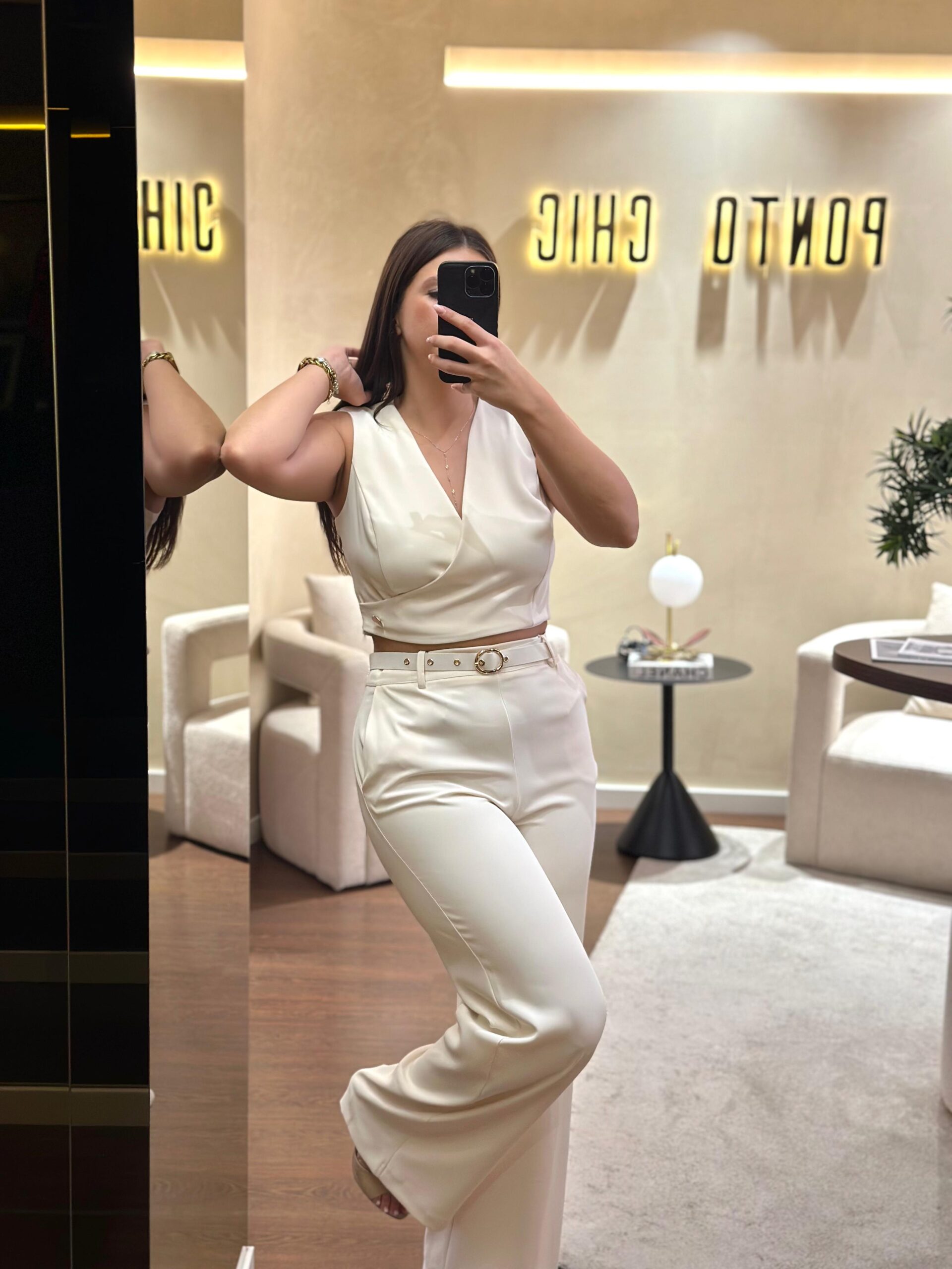 O top sem mangas da marca Renascimento é uma peça sofisticada e versátil, perfeita para elevar qualquer look. Confeccionado em 96% poliéster e 4% elastano, apresenta um corte cruzado com decote em V que valoriza a silhueta e acrescenta um toque elegante e feminino. O tecido em crepe oferece fluidez e conforto, adaptando-se facilmente a combinações tanto para ocasiões formais como para produções mais descontraídas.