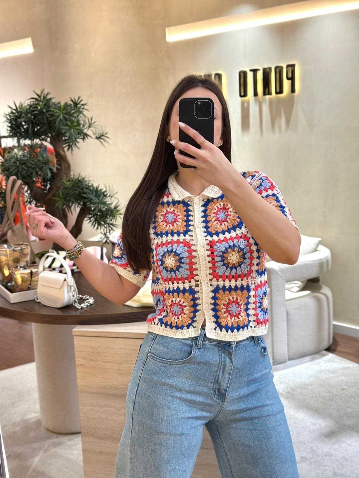 BLUSA CROCHET MULTICOR COM BOTÕES PONTO CHIC