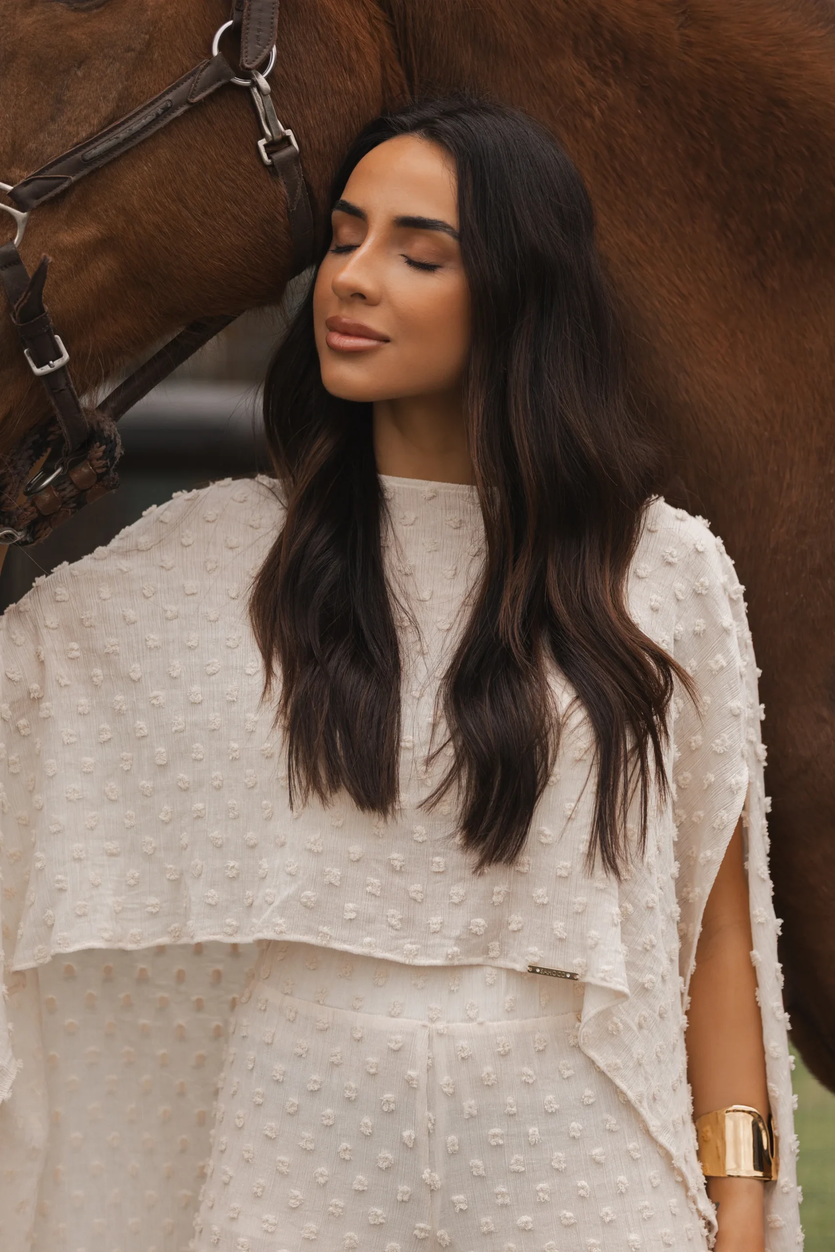 Blusa fluida em tom cru confeccionada em 98% rayon (viscose) e 2% nylon, um tecido leve e delicado que proporciona um caimento natural e elegante. A textura em relevo distribuída por toda a peça acrescenta dimensão e sofisticação, criando um efeito visual subtil e feminino.