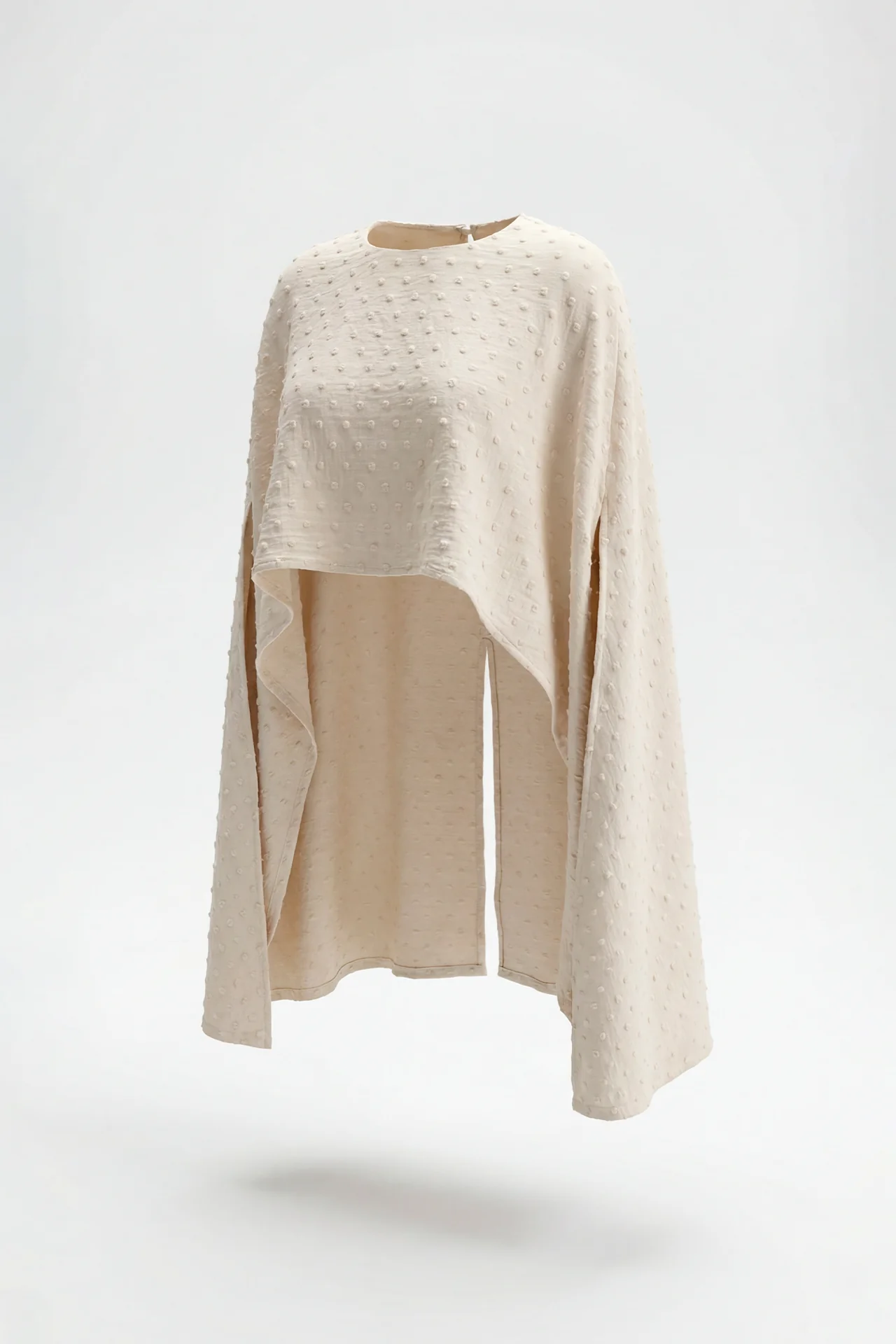 Apresenta um corte solto que favorece o movimento do tecido e reforça a sensação de leveza. As mangas amplas e o acabamento irregular na base contribuem para um design fluido e contemporâneo, perfeito para looks elegantes com um toque romântico.