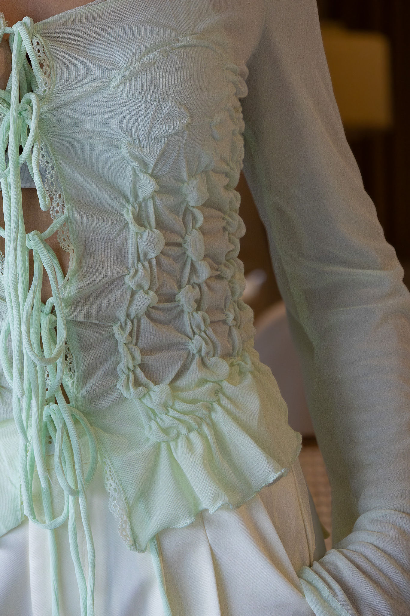 Destaca-se pelo trabalho de franzidos estruturados na frente e nas costas, que criam textura, volume e valorização da silhueta de forma elegante. O decote em V com acabamento em renda delicada acrescenta feminilidade e sofisticação à peça, enquanto o atilhamento frontal ajustável permite regular o encaixe ao corpo, criando diferentes efeitos de modelação.