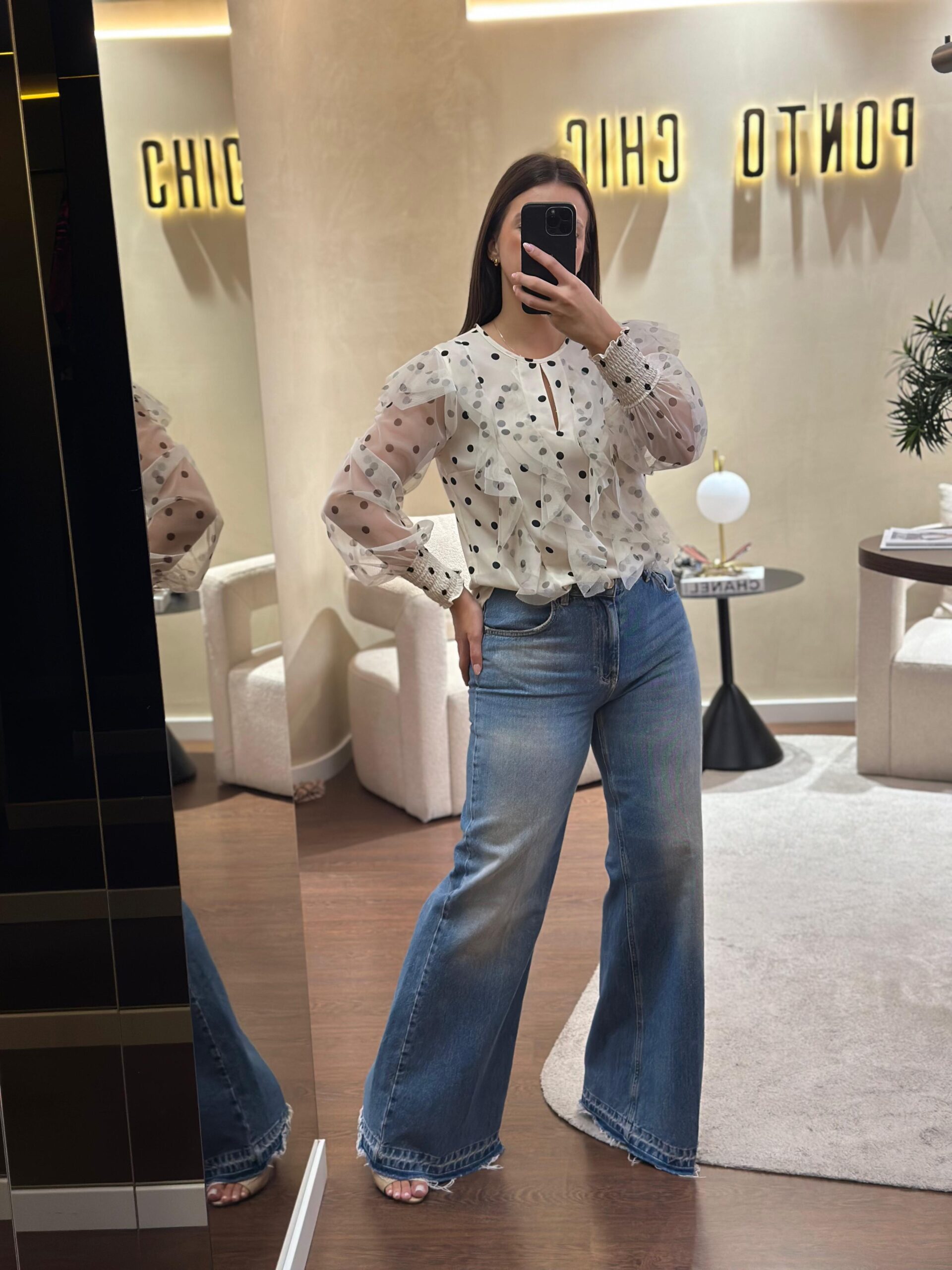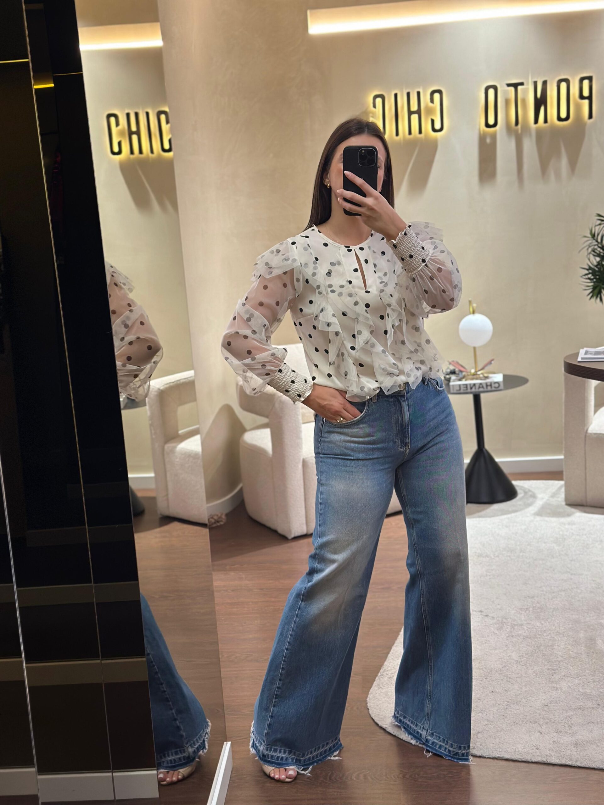 BLUSA COM PORMENOR DE FOLHOS EM TECIDO CHIFFON NA FRENTE. MANGA EM CHIFFON COM PUNHO DE ELÁSTICOS. 100% POLIÉSTER