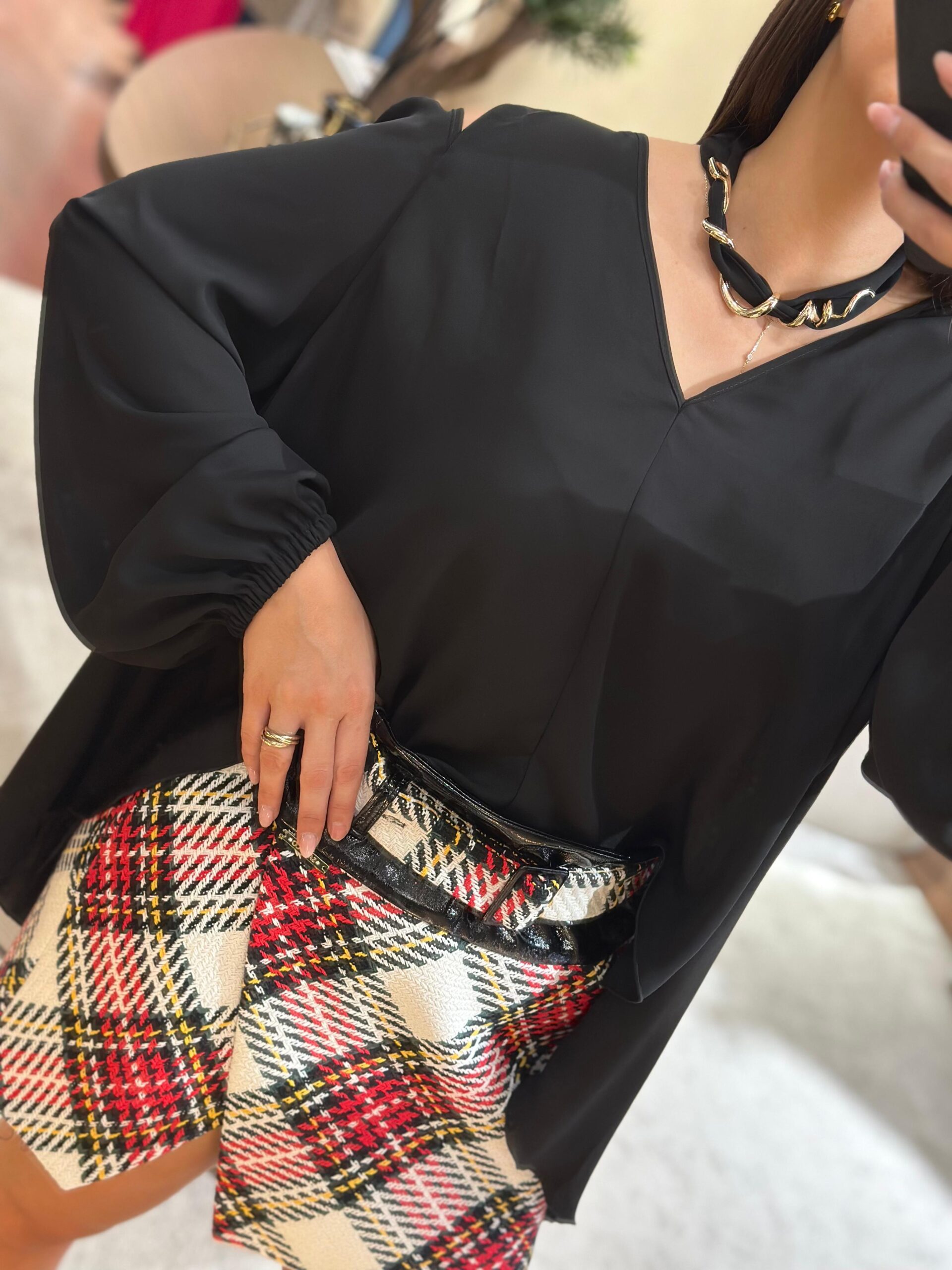 A blusa Sahoco preta é a escolha perfeita para quem procura elegância com um toque de ousadia. Confeccionada em 100% poliéster, apresenta uma fluidez sofisticada e um caimento leve, ideal para looks modernos e versáteis.