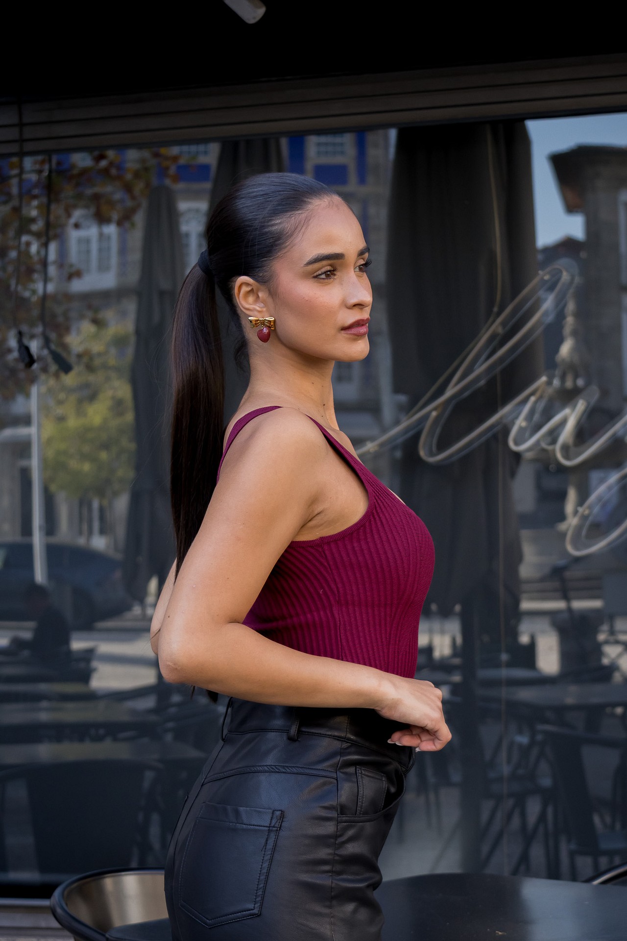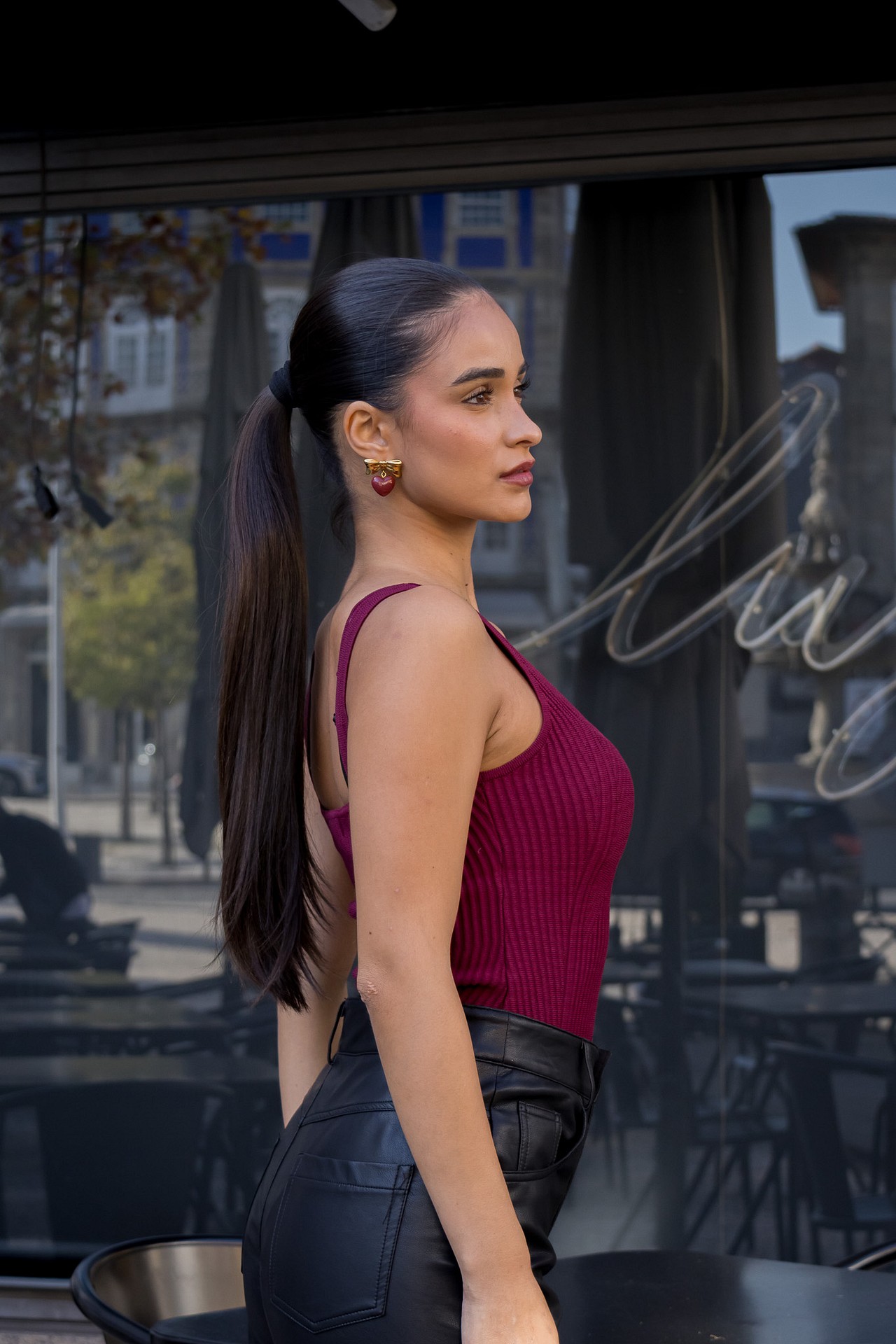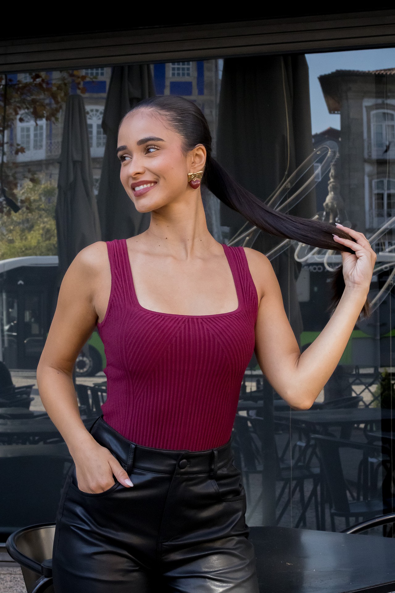 Ideal para coordenar com saias, calças de alfaiataria ou peças em pele, o body bordô Ponto Chic é um essencial moderno que transita com elegância do dia para a noite.
