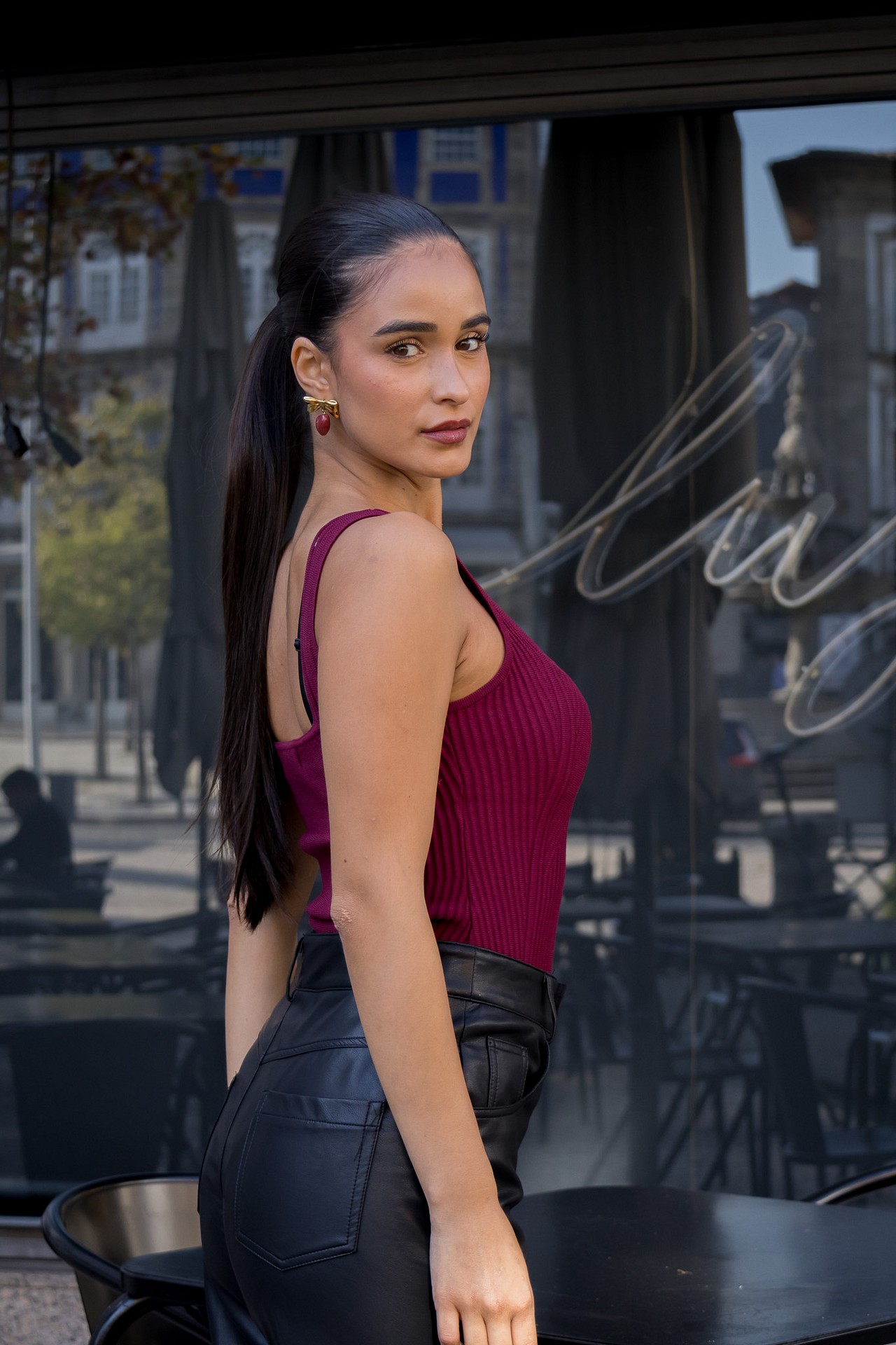O design apresenta malha canelada vertical que alonga a figura e um decote reto com alças médias, equilibrando modernidade e feminilidade. O corte justo valoriza as curvas e torna esta peça uma base versátil para inúmeras combinações.