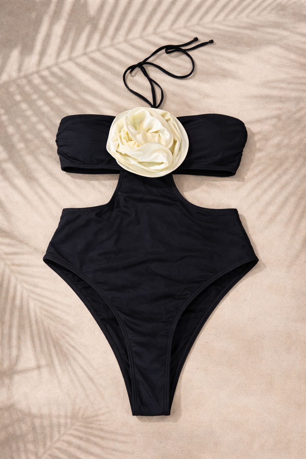 O grande destaque da peça é a aplicação de flor em contraste na zona do peito, que cria um efeito visual marcante e feminino. O decote estruturado com ligeiro drapeado valoriza a silhueta, enquanto as alças finas ajustáveis permitem um encaixe perfeito.