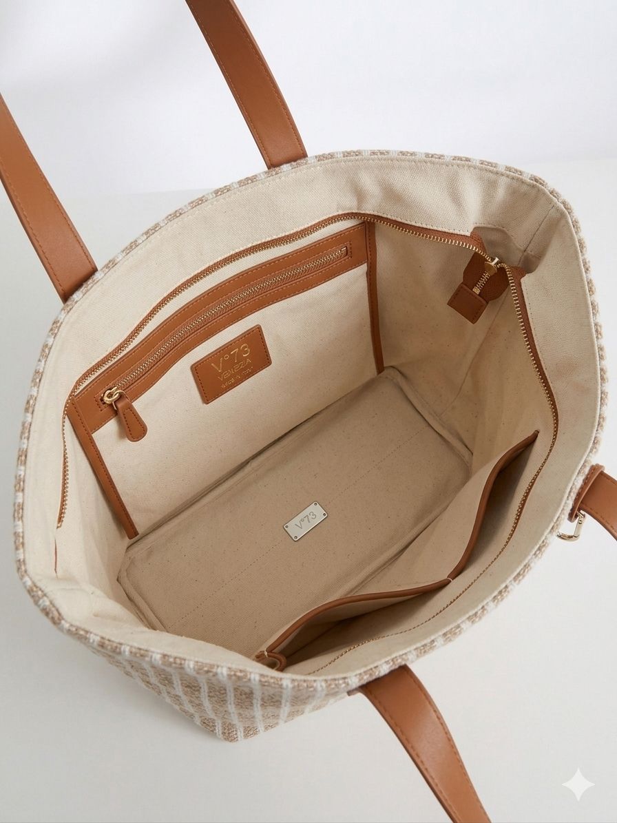 De formato amplo e estruturado, apresenta alças em pele que garantem conforto e durabilidade, mantendo uma estética sofisticada. O interior, funcional e discreto, inclui fecho superior e bolso interior com fecho, pensado para uma organização prática no dia a dia.