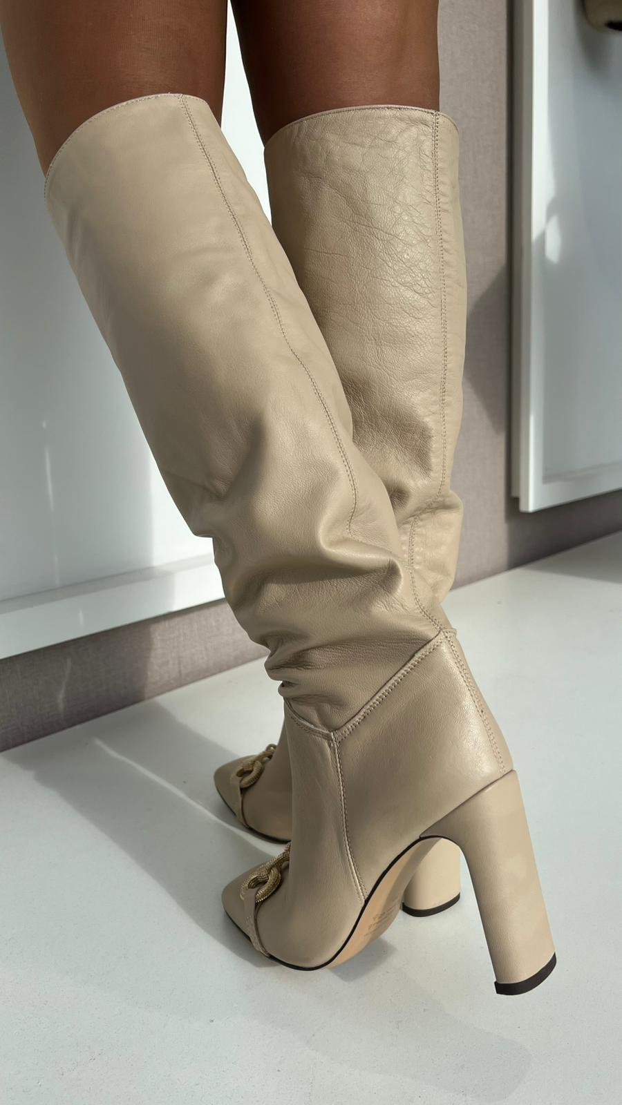 A bota alta bege Rinascimento é uma expressão refinada de estilo e feminilidade.