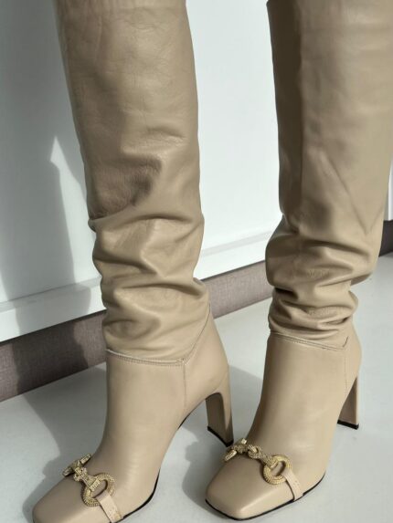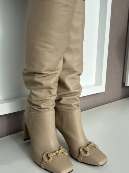 O cano alto é realçado por franjas longas em movimento, que trazem um toque boho-chic e sofisticado, enquanto o bico fino com detalhe metálico acrescenta modernidade e elegância. O salto médio garante conforto sem perder a imponência.