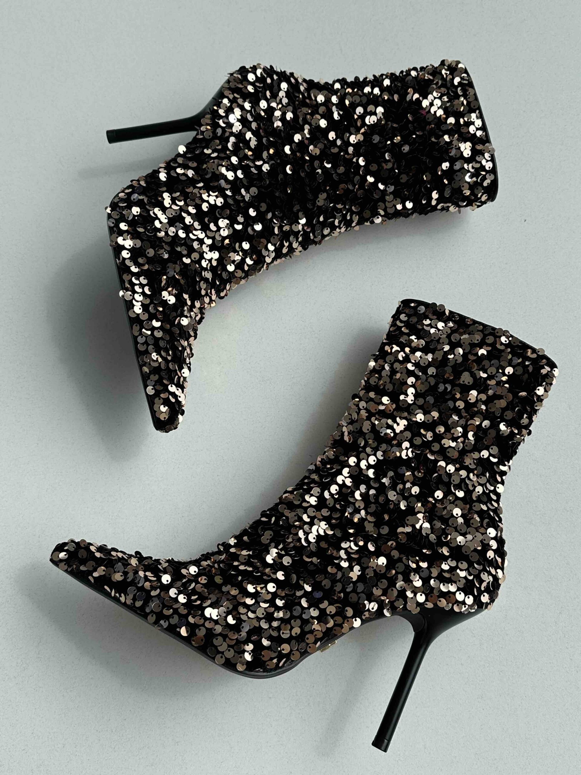 Estes botins da Rinascimento combinam o glamour das lantejoulas bronze com o design elegante do bico fino e do salto agulha, criando uma peça de impacto irresistível.