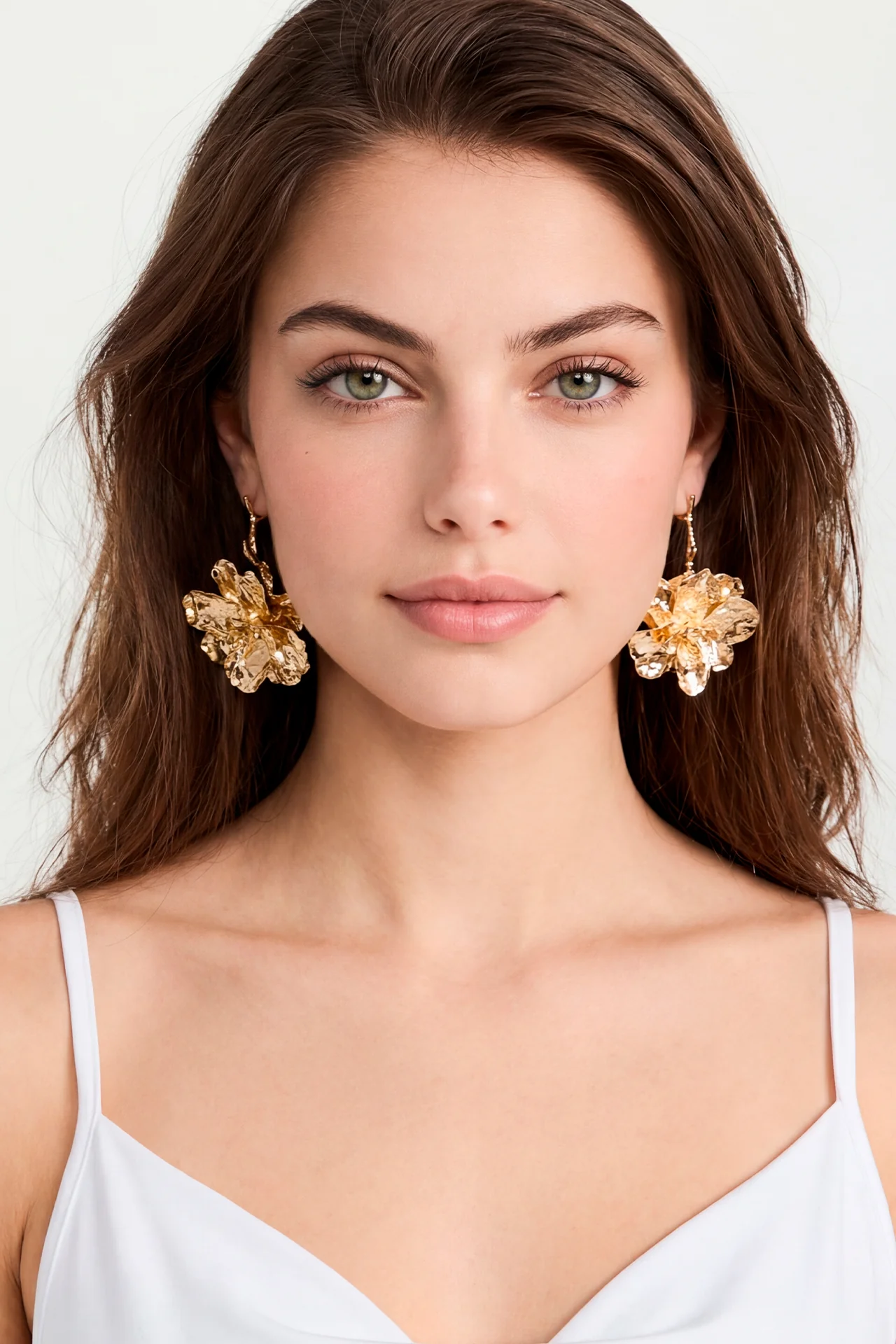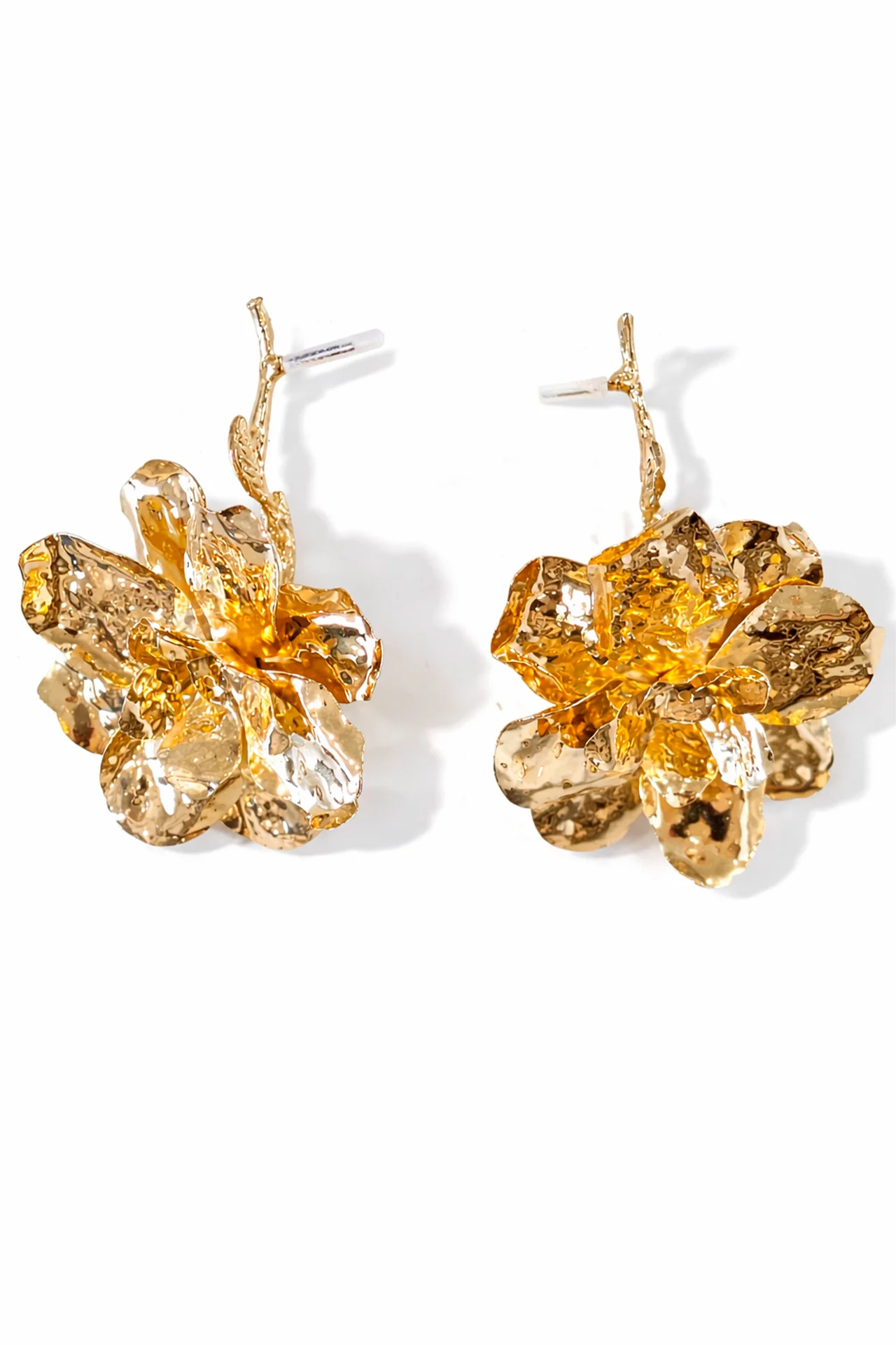 Brincos em metal com acabamento dourado e design em forma de flor tridimensional. As pétalas apresentam um efeito texturizado que reflete a luz de forma elegante, criando um brilho sofisticado e um visual marcante.