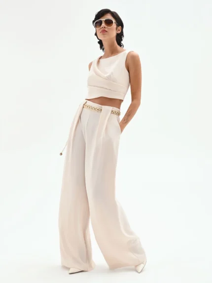 CALÇA BEGE FLUIDA COM PREGAS NA CINTURA RINASCIMENTO