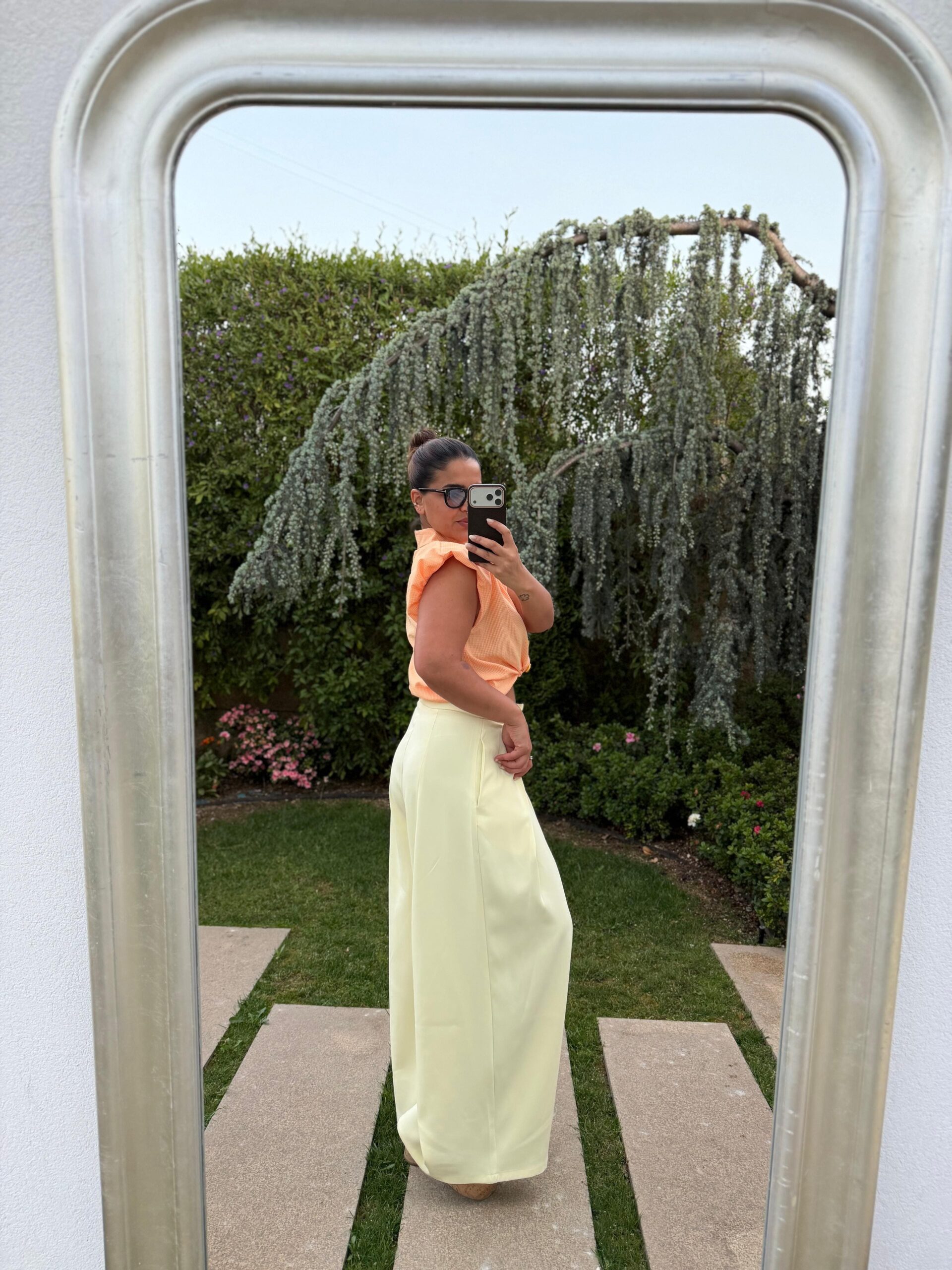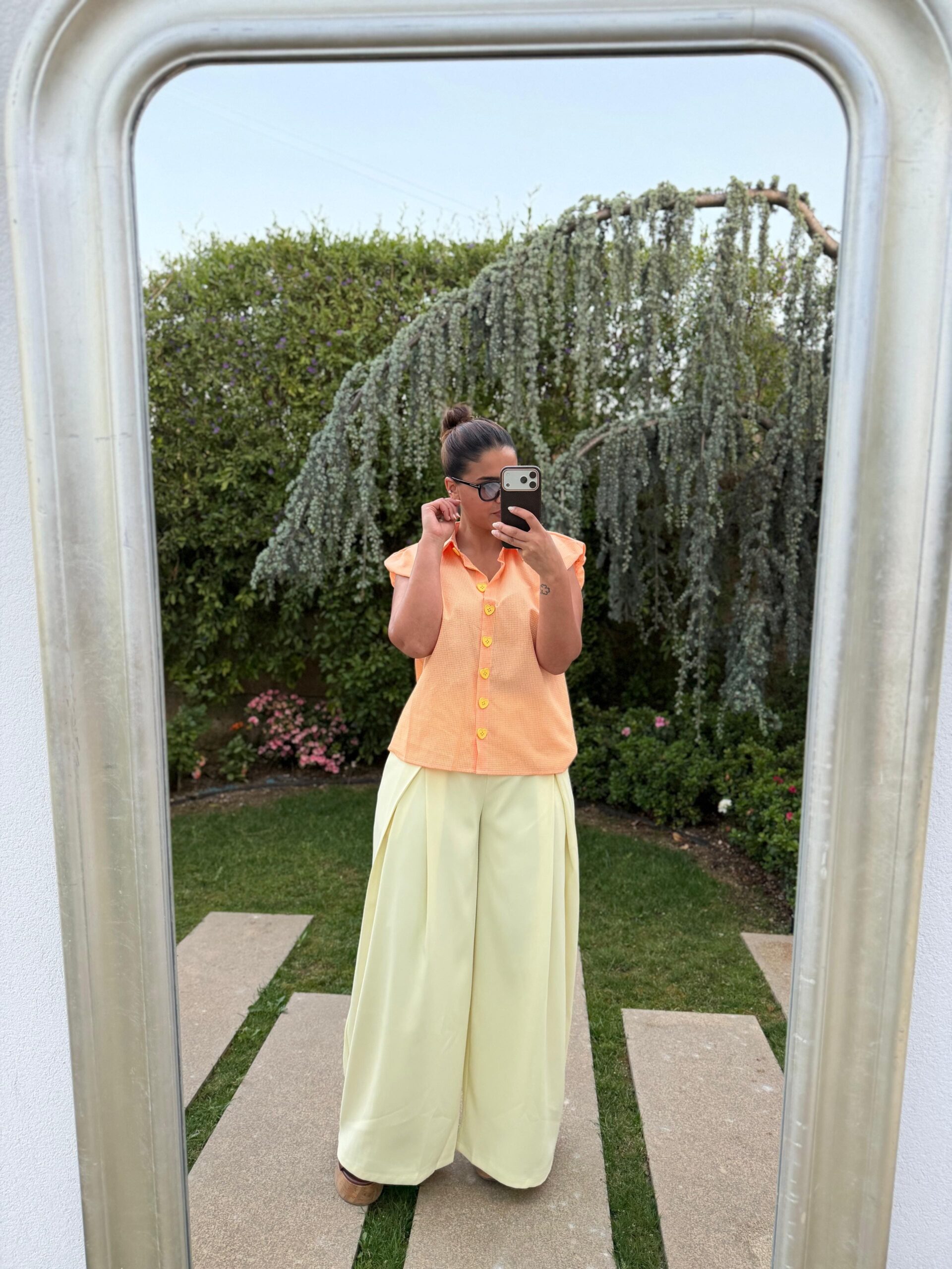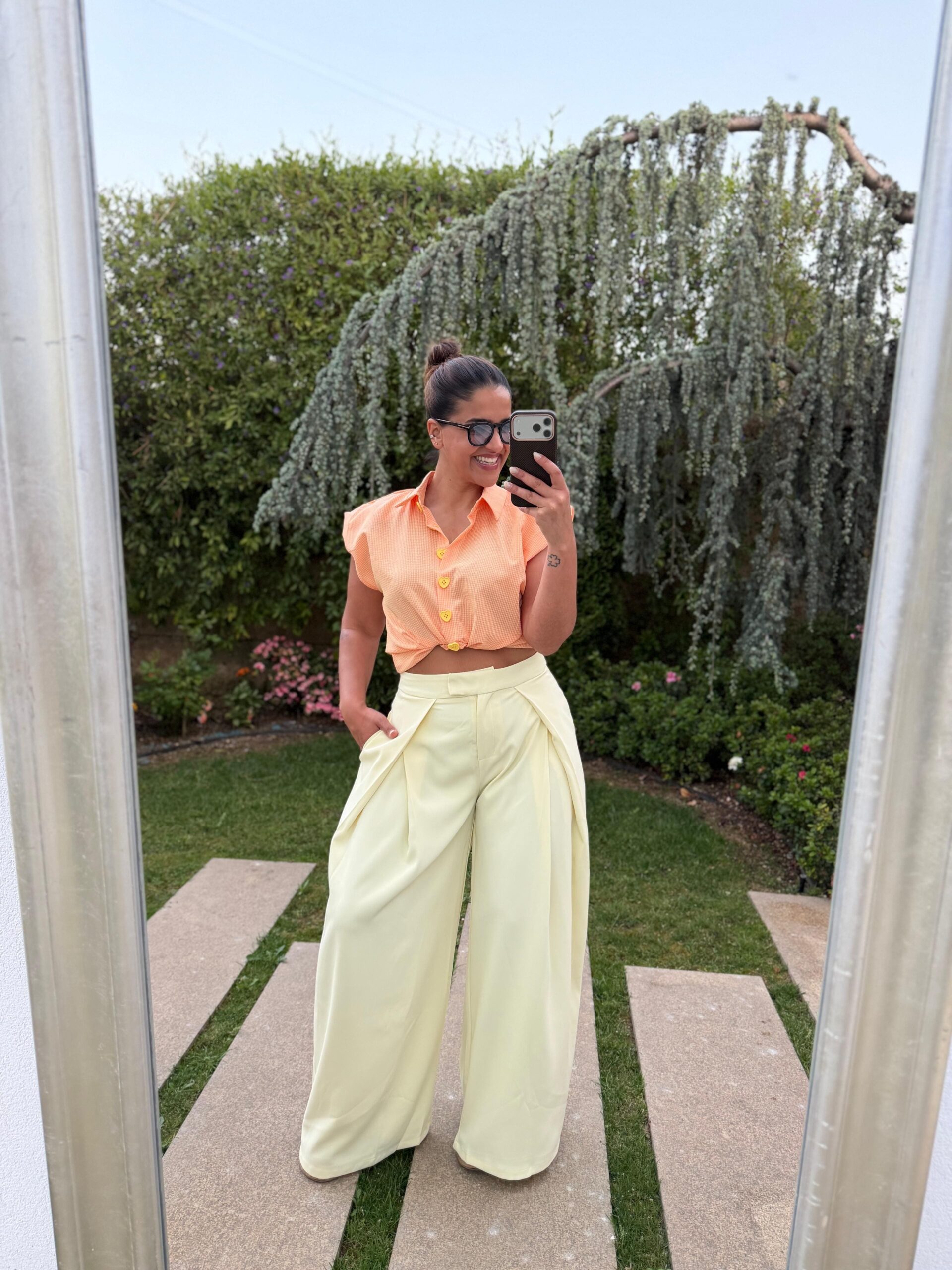 Calça em tom amarelo manteiga, confecionada em tecido leve 100% poliéster, que proporciona conforto e um caimento elegante ao longo do dia.