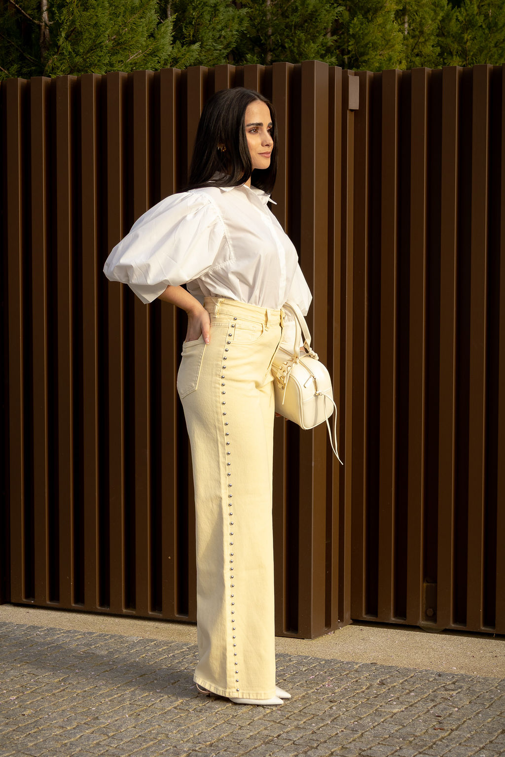 CALÇA AMARELO CLARO COM APLICAÇÕES METÁLICAS PONTO CHIC