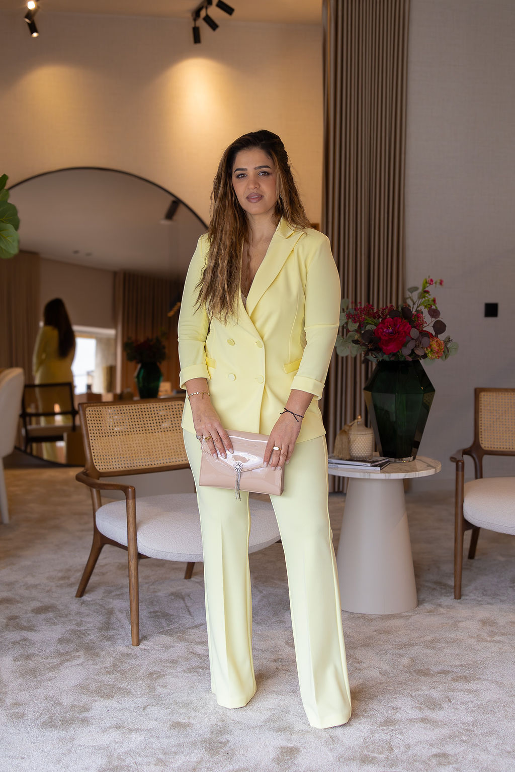 Calça em tom amarelo claro, de inspiração alfaiataria moderna, com uma silhueta fluida e elegante que valoriza a linha da perna e alonga a silhueta. Confeccionada em tecido técnico com 95% poliéster e 5% elastano, oferece conforto, elasticidade e excelente estrutura, garantindo um caimento sofisticado sem perder leveza.
