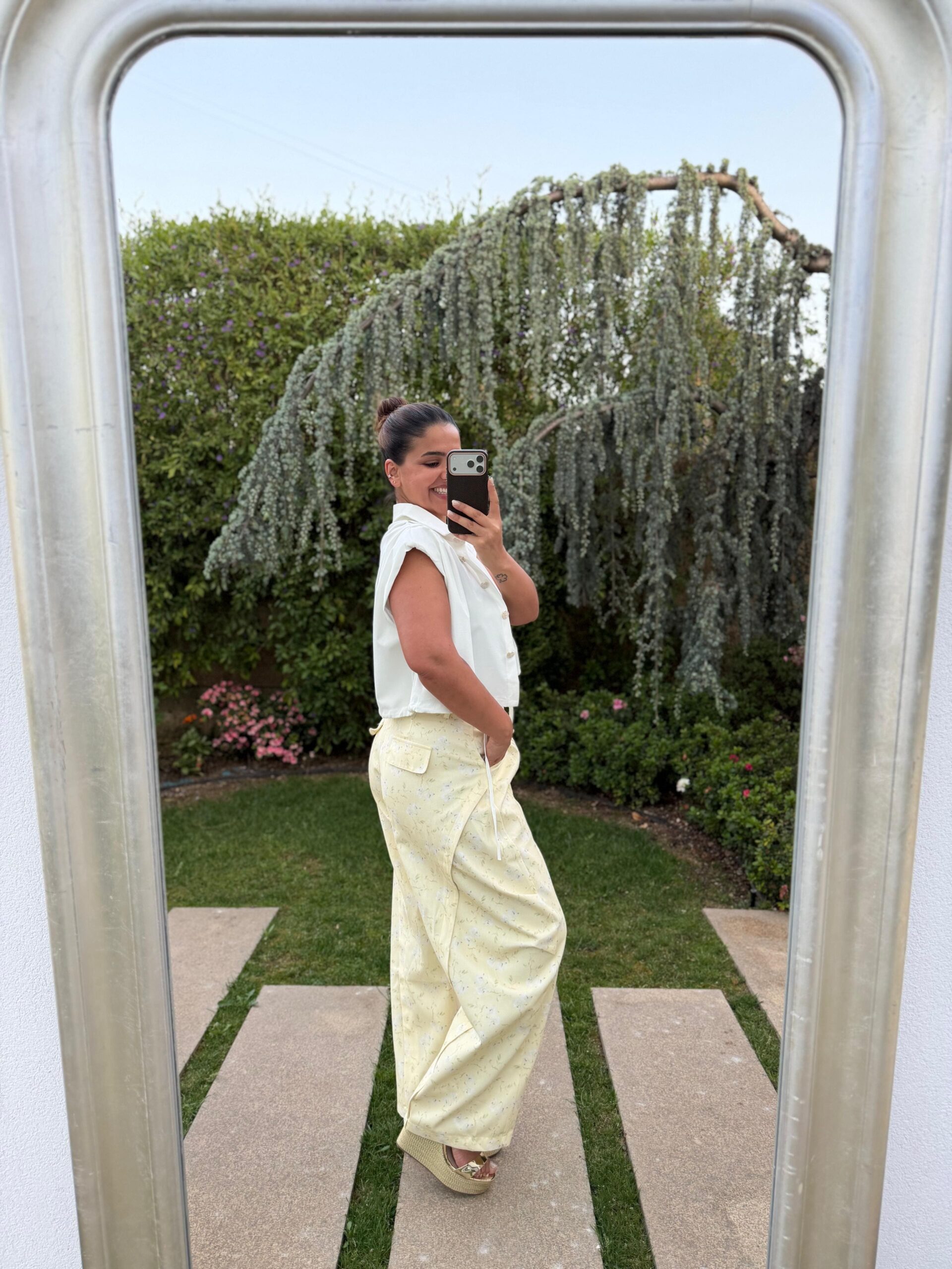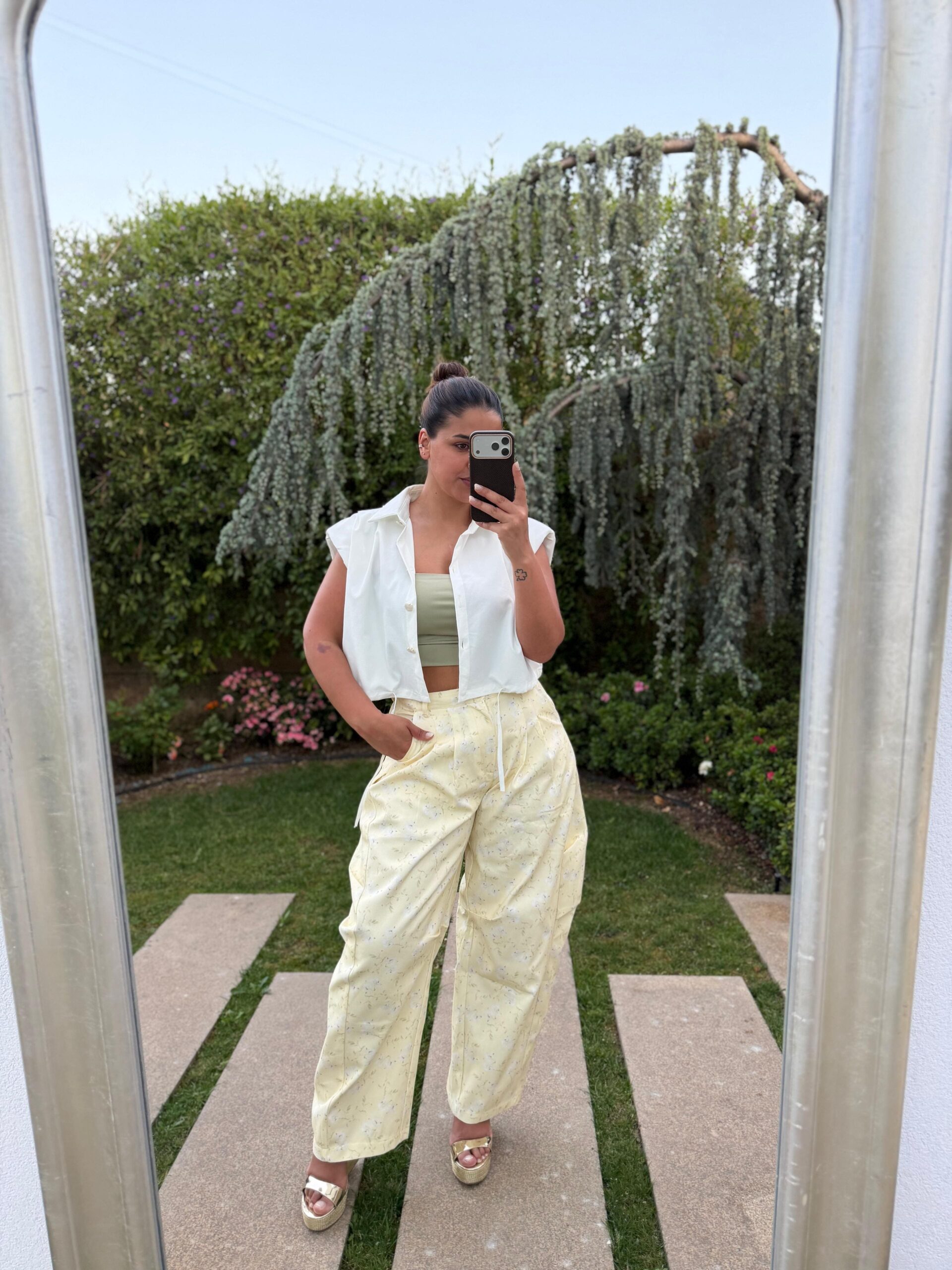 Esta calça em tom amarelo claro com padrão floral delicado destaca-se pela sua leveza e estética suave, perfeita para looks femininos e elegantes. A composição em 100% algodão garante conforto, respirabilidade e um toque natural ao longo de todo o dia.