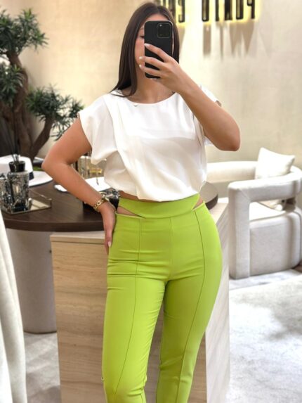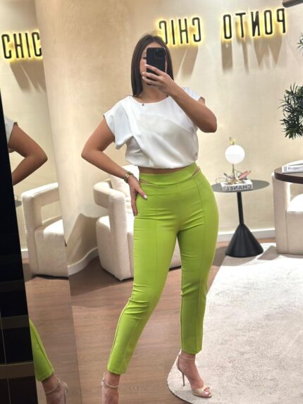 Calça tecido acetinado, com punho de elástico no fundo. Pormenor de folho na lateral Elástico na cinta com cordão para atar na frente. Composição: 100% Viscose