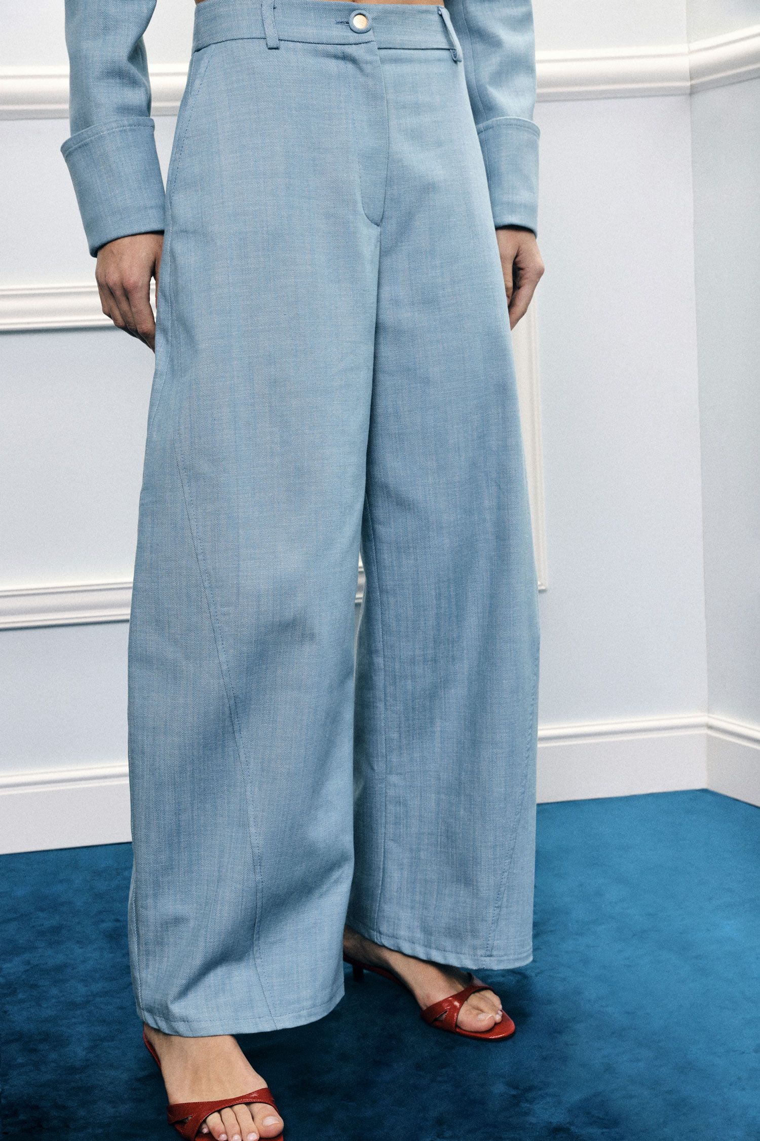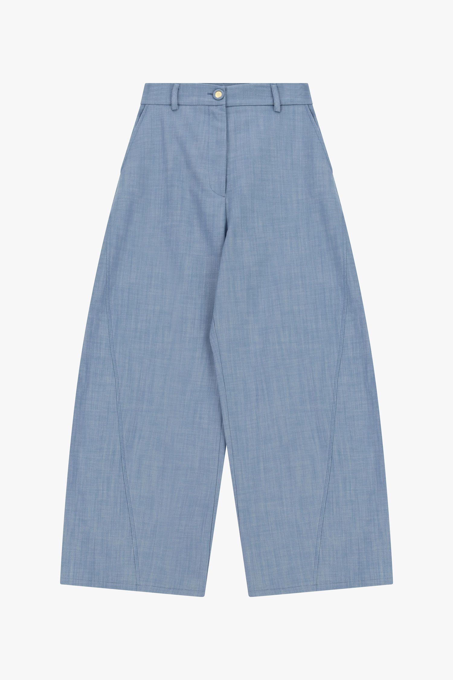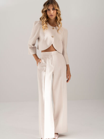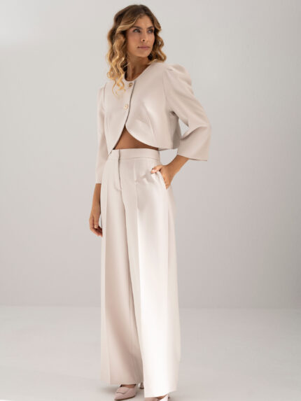 O modelo apresenta corte amplo e fluido, com pinças frontais que conferem estrutura e valorizam a silhueta de forma subtil. A cintura subida com presilhas e fecho frontal com botão reforça o carácter clássico da peça, enquanto o caimento solto garante um visual moderno e sofisticado.