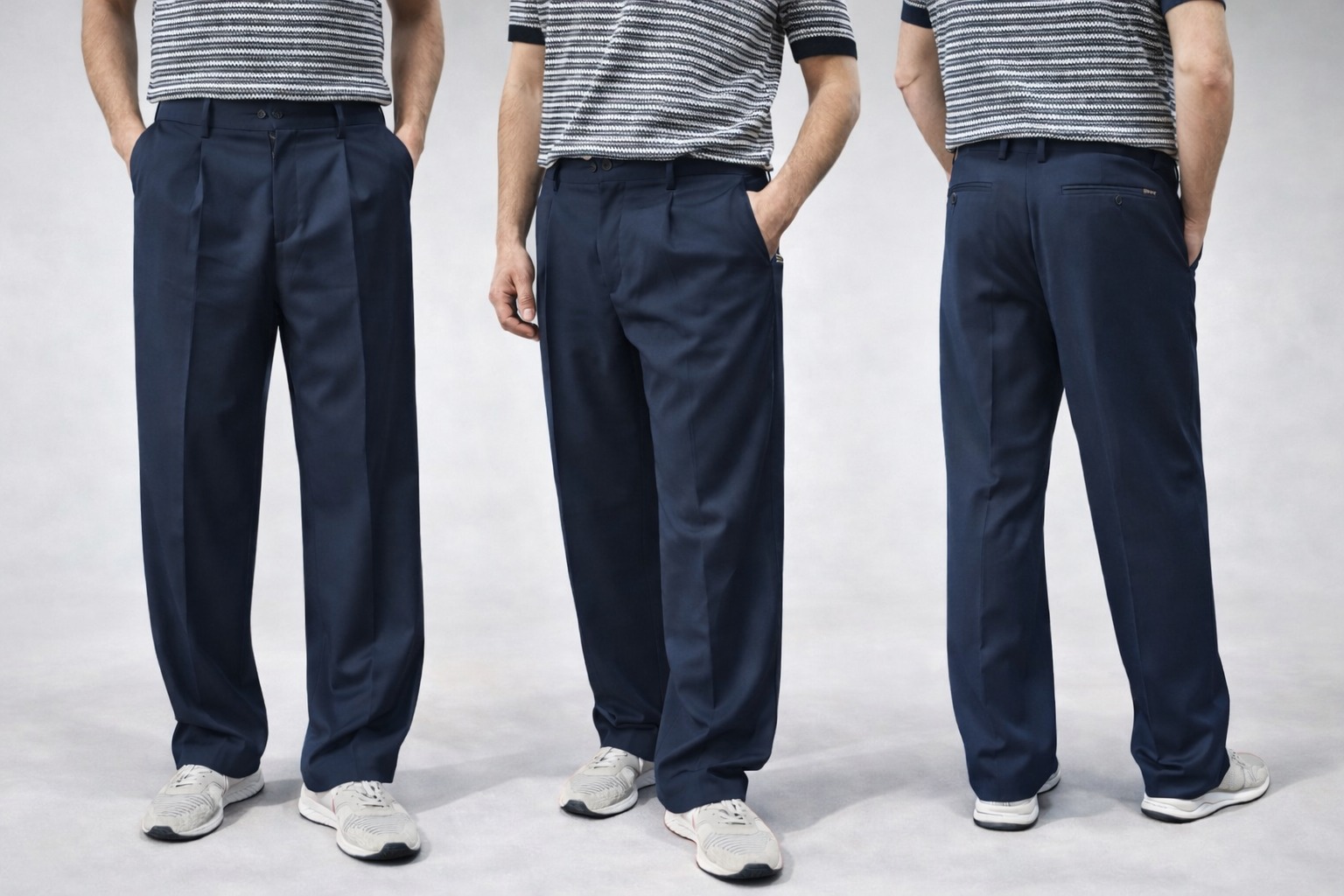 Apresenta um design intemporal com pregas frontais que acrescentam sofisticação ao look, cintura estruturada com presilhas para cinto e fecho frontal com botão. O corte é reto, elegante e pensado para alongar a silhueta.