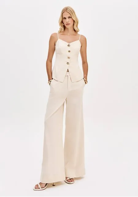 A perna é ampla e direita, criando movimento e alongando visualmente a silhueta. O tecido, apesar de leve, mantém estrutura suficiente para um caimento cuidado e refinado.
