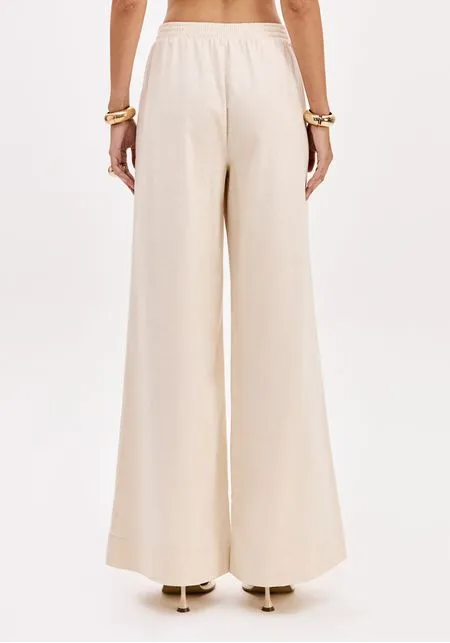 Calça bege de silhueta fluida e elegante, confecionada em 100% algodão, garantindo respirabilidade, conforto e um toque natural sofisticado.