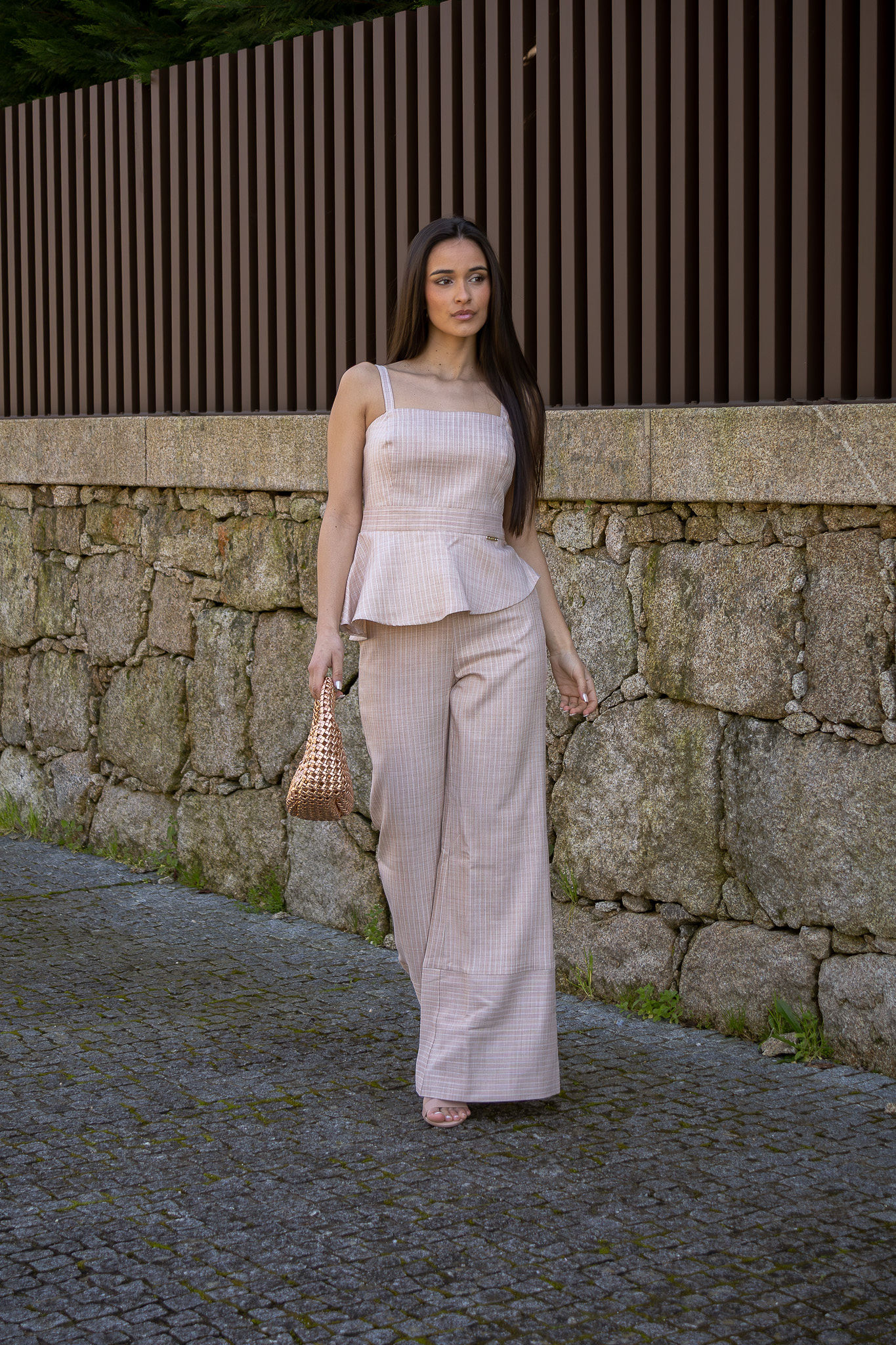 Uma calça de inspiração alfaiataria que combina elegância e fluidez numa proposta sofisticada e intemporal. O padrão de riscas finas em tom bege cria um efeito visual alongador, reforçando a silhueta com discrição e classe.