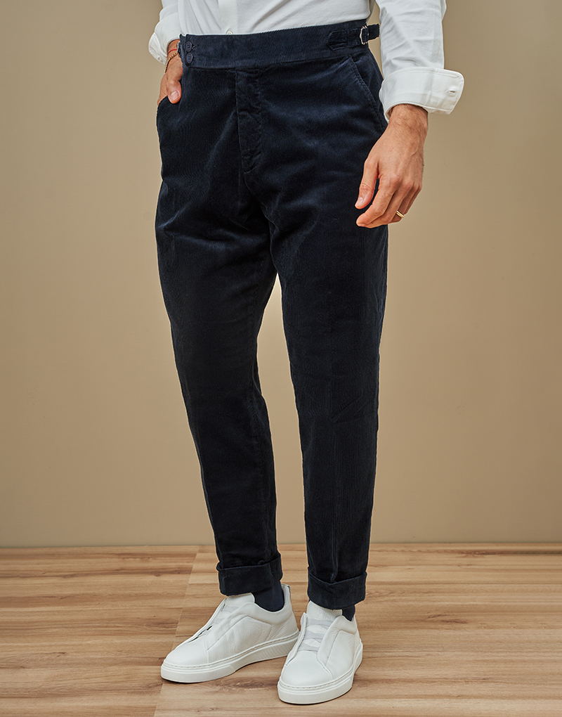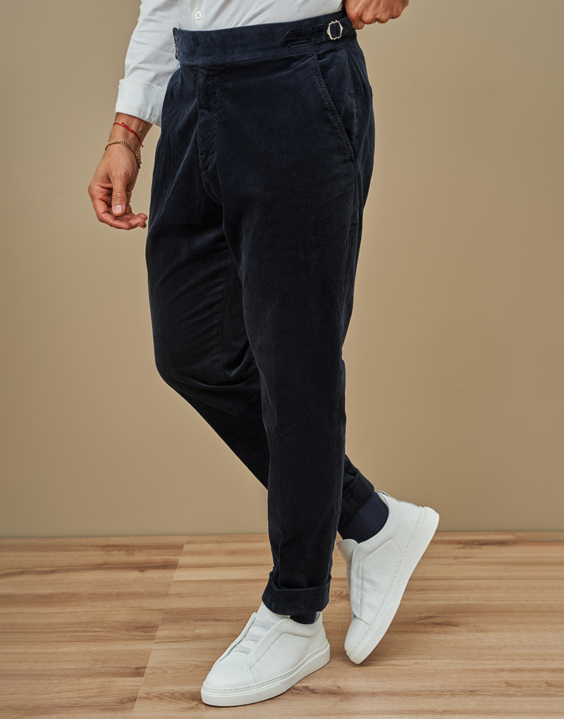 Perfeita para a meia-estação e inverno, a calça bombazina azul adapta-se facilmente a looks casuais ou mais arrumados. Combina na perfeição com malhas leves, camisas ou casacos estruturados, sendo uma escolha ideal para quem procura estilo e conforto com personalidade.
