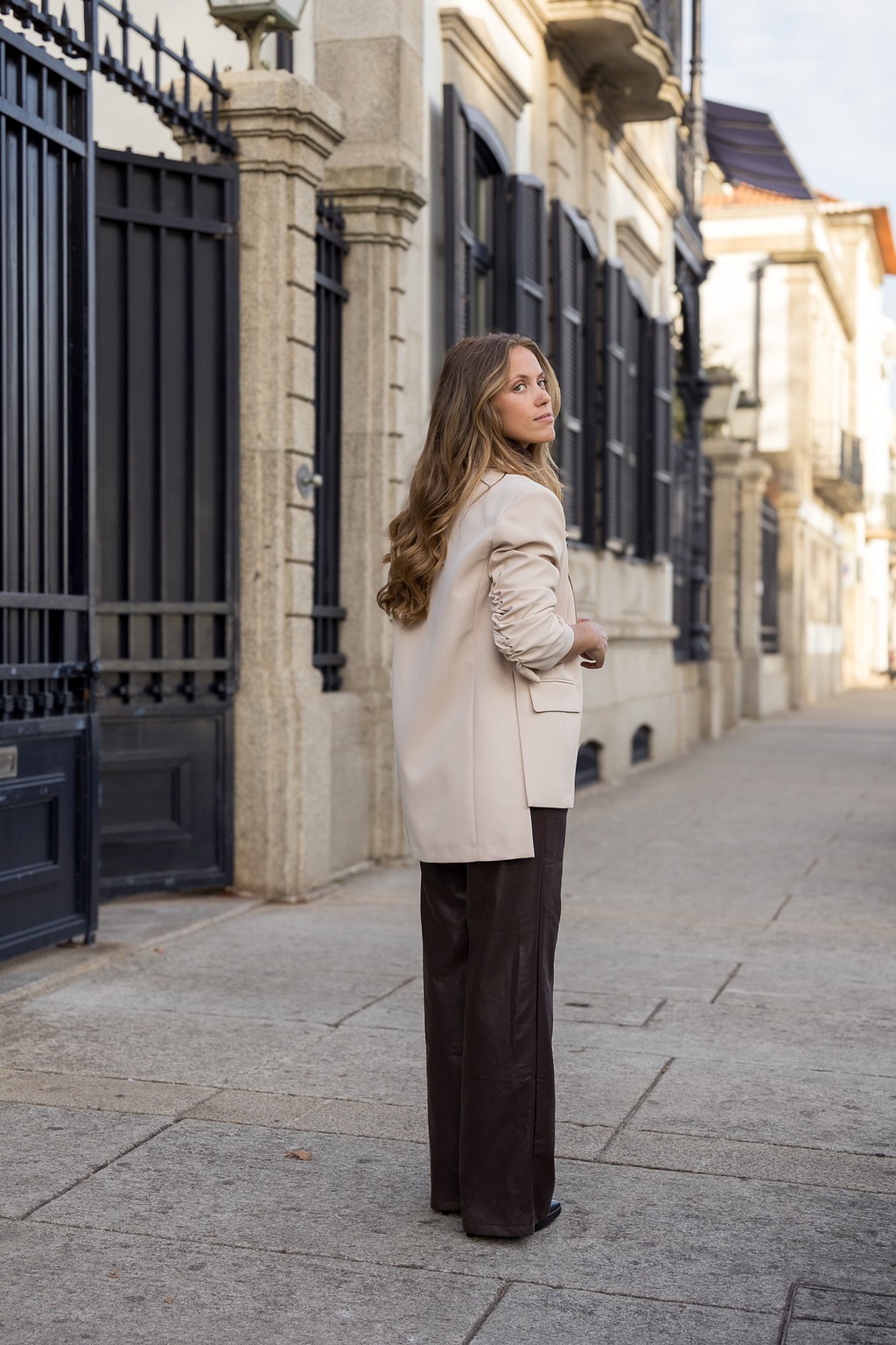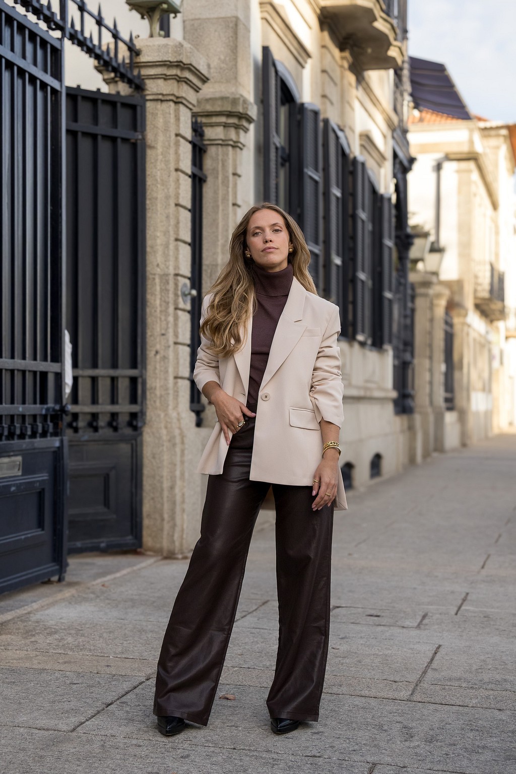 Ideal para looks de outono e inverno, a calça em ecopele castanha Ponto Chic adapta-se facilmente a coordenados com malhas, camisas ou blazers — resultando sempre num visual elegante e cheio de personalidade.