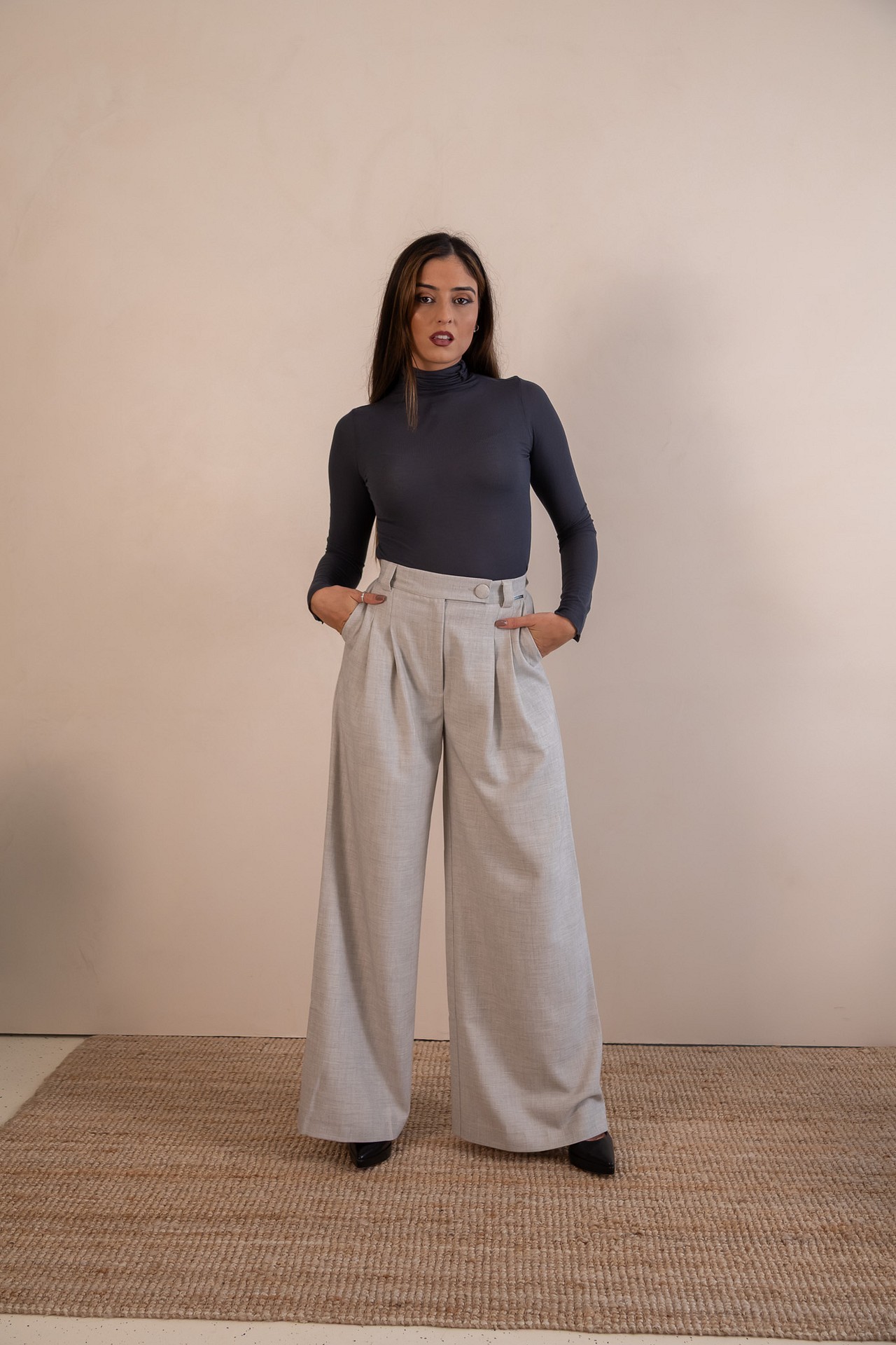 Com cintura subida, pinças frontais e um botão forrado que reforça o toque premium, este modelo apresenta um corte amplo e fluido que alonga a silhueta e confere um visual contemporâneo. Os passadores largos e o fecho discreto mantêm a peça polida e versátil.