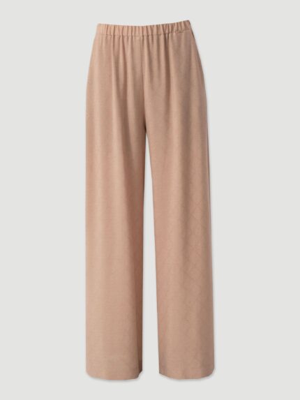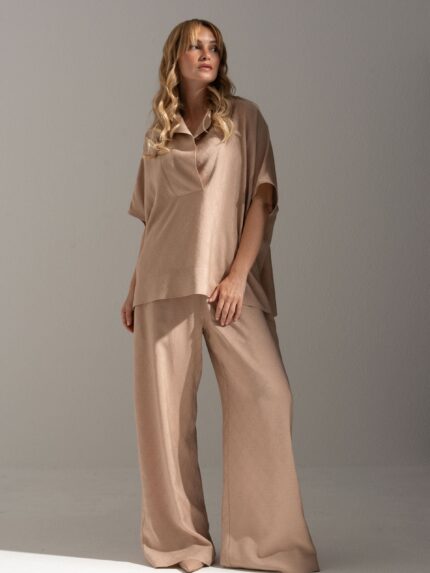 Calça em tom cru de cintura subida com corte fluido e elegante, pensada para alongar a silhueta e conferir sofisticação imediata ao coordenado.