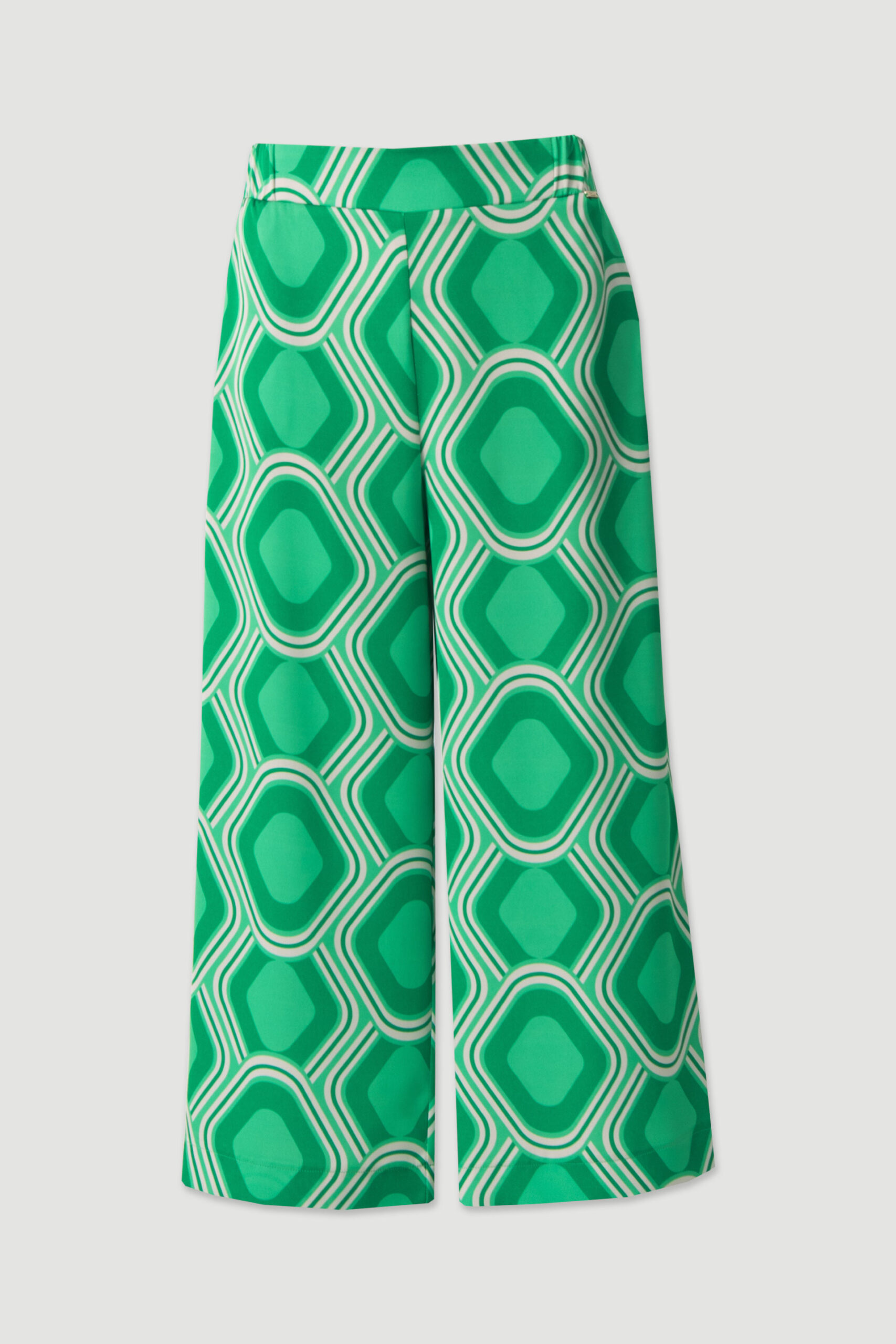 Calça culotte em tecido leve e fluido, com estampado geométrico em tons de verde que confere um visual moderno e marcante. Apresenta cintura elástica para maior conforto e ajuste, e corte amplo de perna larga que proporciona movimento e elegância. Uma peça cheia de personalidade, ideal para looks descontraídos com um toque sofisticado.