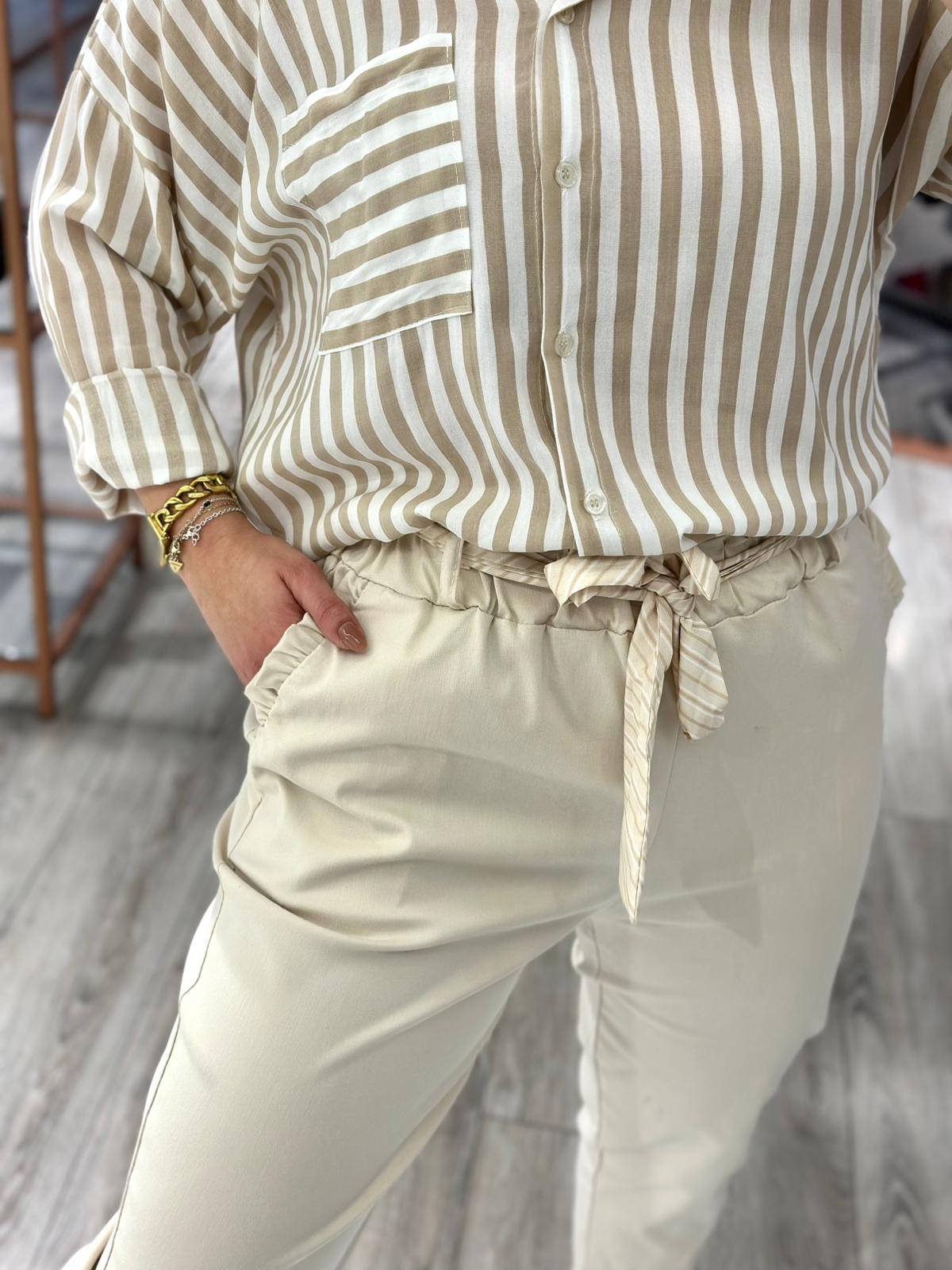 CALÇA DE CINTURA ALTA COM CINTO ÀS RISCAS BEGE PONTO CHIC