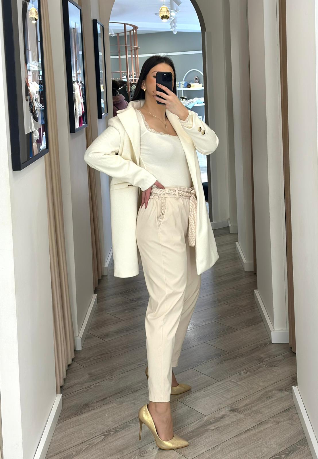 Esta calça em tom bege claro da Ponto Chic destaca-se pelo seu design elegante e confortável, ideal para looks descontraídos mas sofisticados. A cintura alta com elástico proporciona um ajuste confortável e favorecedor, enquanto o cinto removível em tecido às riscas acrescenta um detalhe delicado e feminino, valorizando a silhueta.