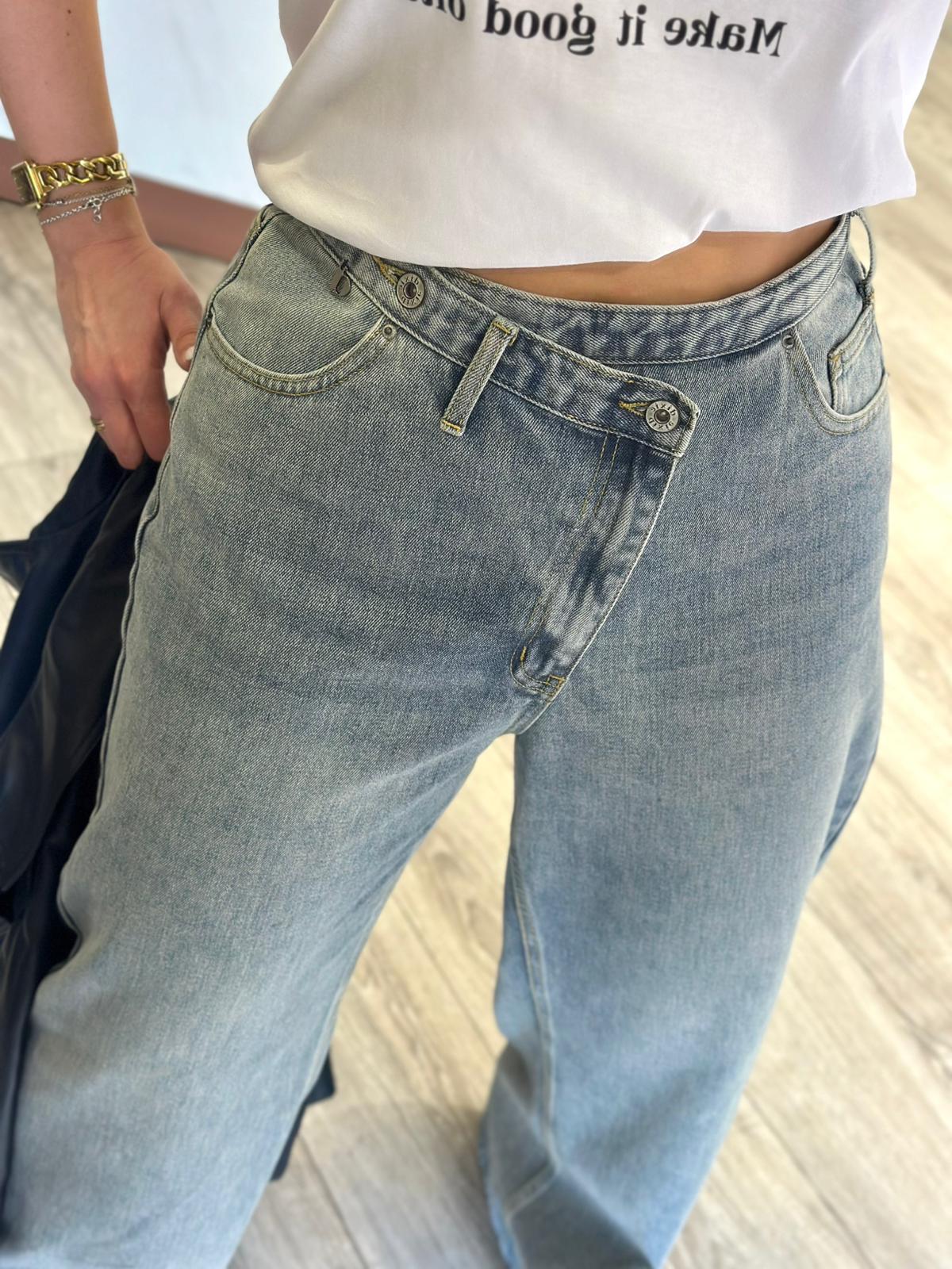 Uma peça de denim pensada para sair do óbvio. Esta calça destaca-se pela cintura assimétrica com sobreposição frontal e botão duplo, um detalhe estrutural que cria impacto visual imediato e valoriza a zona da cintura com um toque contemporâneo.